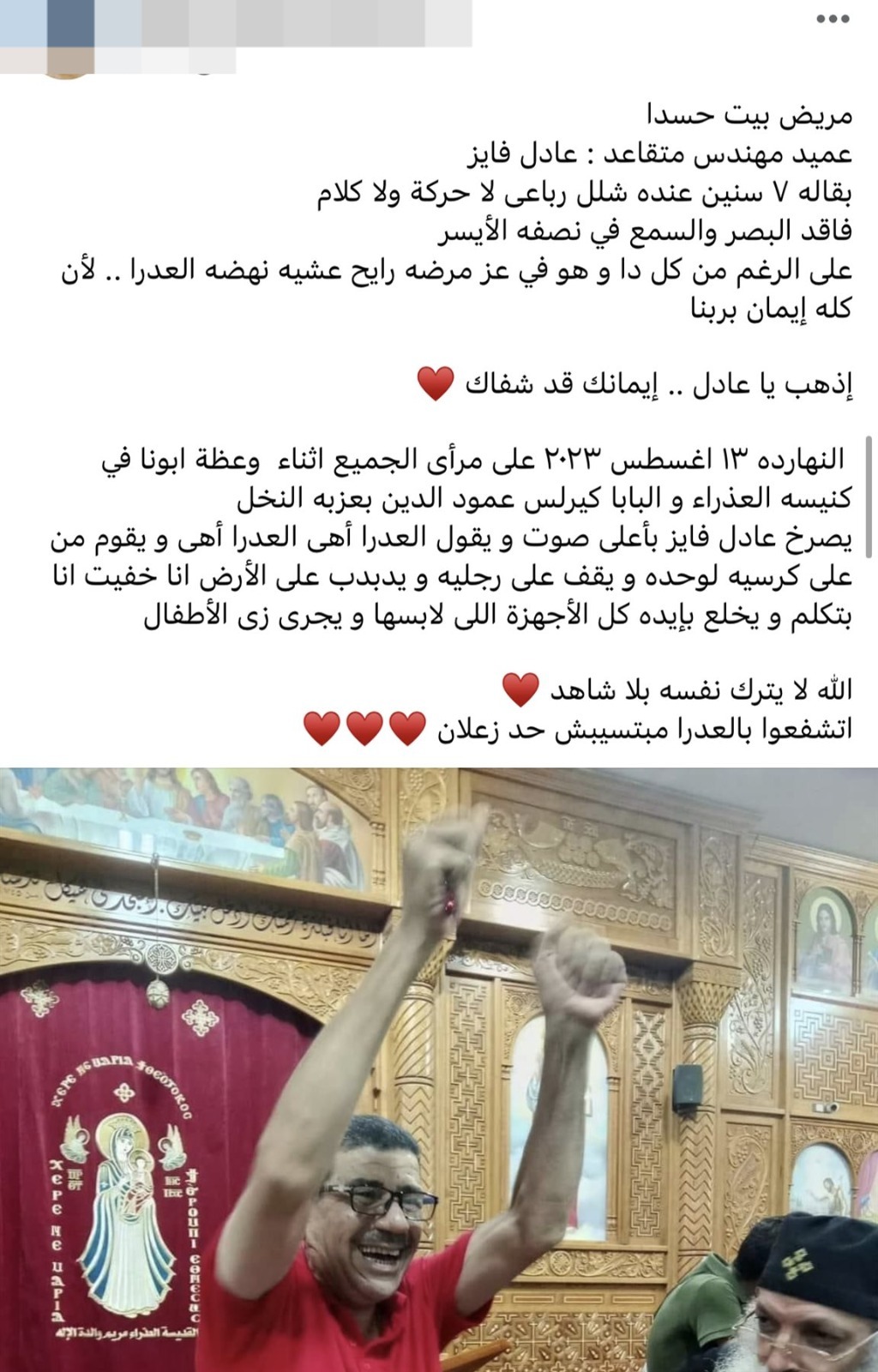 واقعة تداولها رواد مواقع التواصل الاجتماعى بعدما دخل المهندس عماد فايز مصاب بالشلل لكنيسة العذراء ، بلا حركة ولا كلام فى نصفه الأيسر ليقف على قدمه.