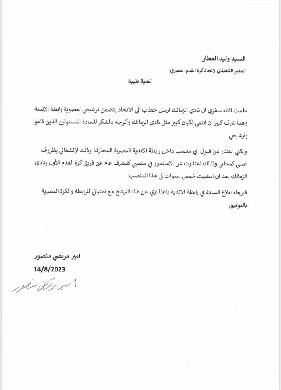 وأرسل أمير مرتضى خطابًا رسميًا إلى اتحاد الكرة يعتذر فيه عن عدم الترشح في انتخابات رابطة الأندية بسبب انشغاله بأعمال المحاماه.