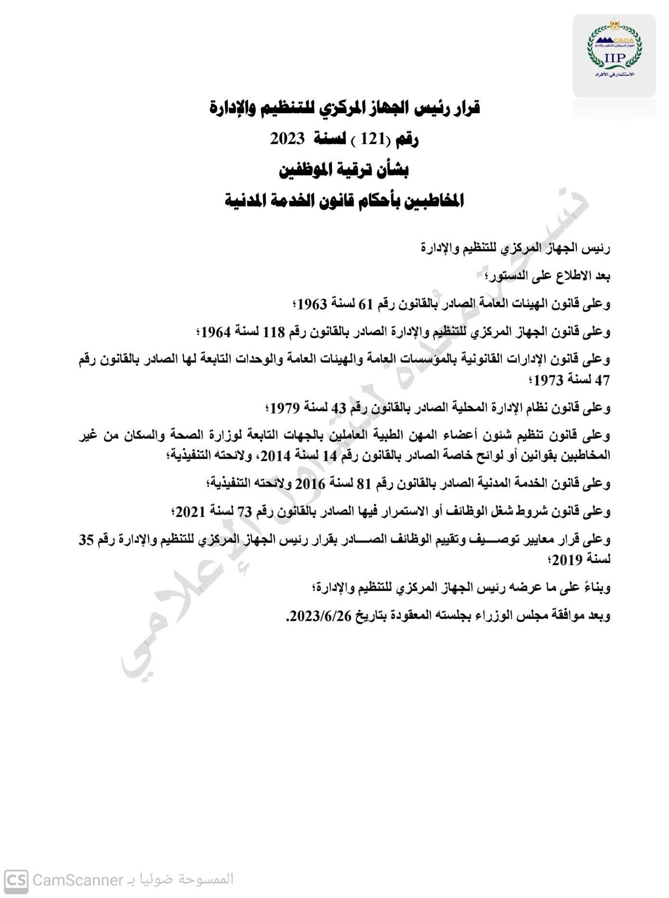 أصدر الدكتور صالح الشيخ، رئيس الجهاز المركزي للتنظيم والإدارة، قرار رقم (121) لسنة 2023 بترقية الموظفين بالجهاز الإداري للدولة، ووفقا للقرار فأنه يسري على الموظفين بالوزارات والمصالح والأجهزة الحكومية ووحدات الإدارة المحلية، الخاضعين لأحكام قانون الخدمة المدنية الصادر بالقانون رقم 81 لسنة 2016، والعاملين بالهيئات العامة الخدمية والاقتصادية الذي يُعد قانون الخدمة المدنية المُشار إليه الشريعة العامة لهم.
