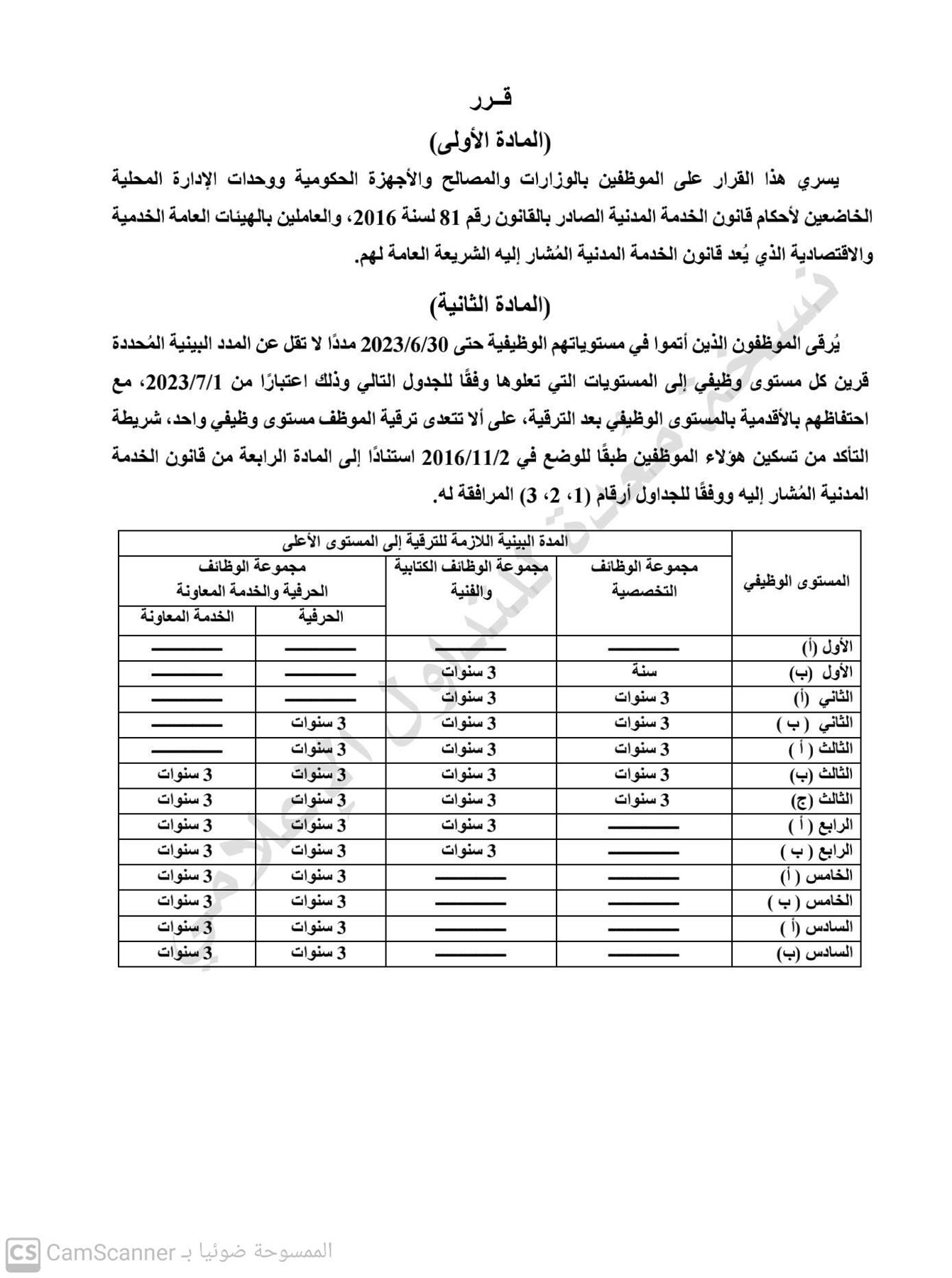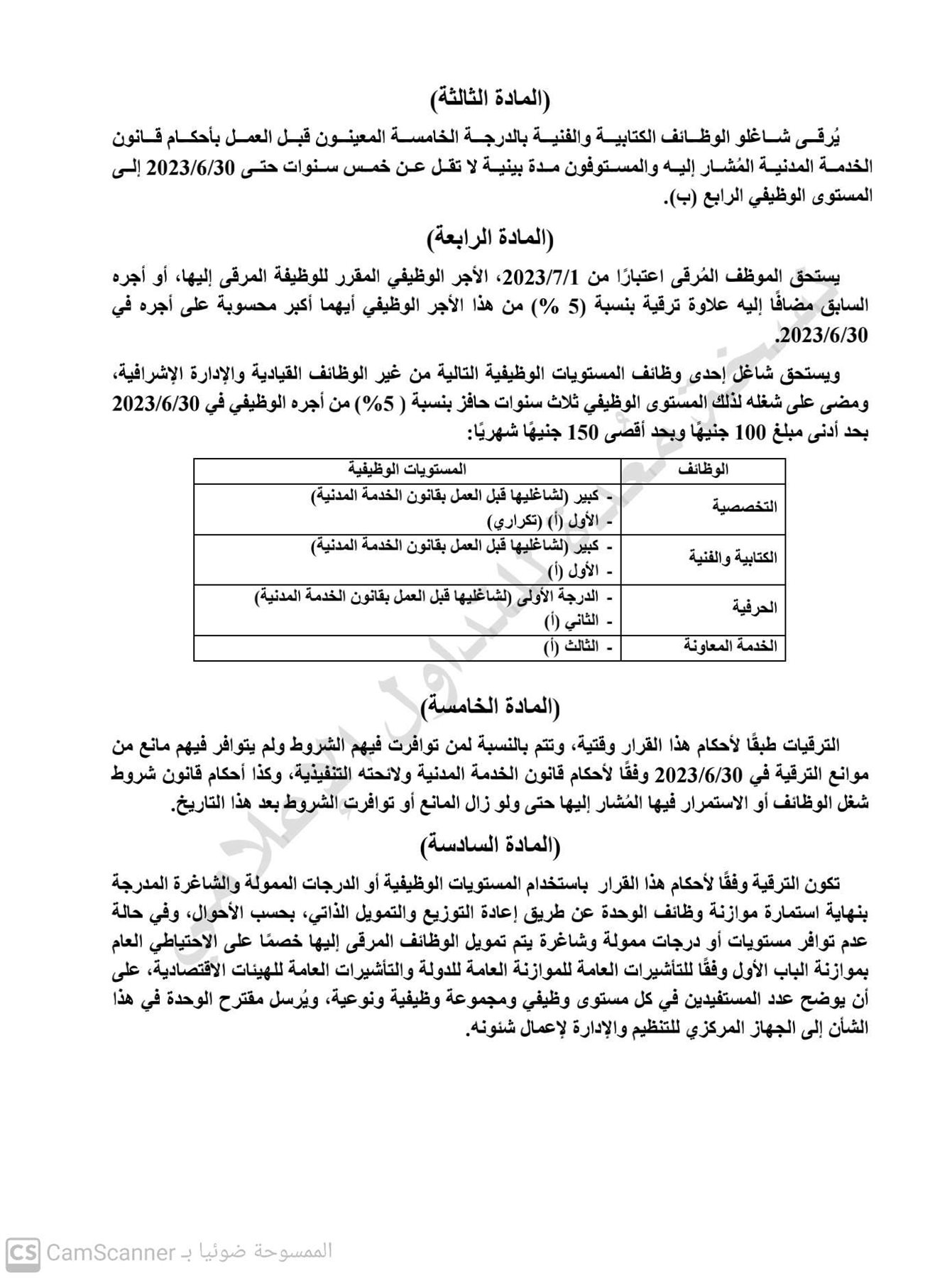 كما تضمن القرار أن يُرقى شاغلو الوظائف الكتابية والفنية بالدرجة الخامسة المعينون قبل العمل بأحكام قانون الخدمة المدنية المُشار إليه والمستوفون مدة بينية لا تقل عن خمس سنوات حتى 30/6/2023 إلى المستوى الوظيفي الرابع (ب)، ويستحق الموظف المُرقى اعتبارًا من 1/7/2023، الأجر الوظيفي المقرر للوظيفة المرقى إليها، أو أجره السابق مضافًا إليه علاوة ترقية بنسبة (5 %) من هذا الأجر الوظيفي أيهما أكبر محسوبة على أجره في 30/6/2023.