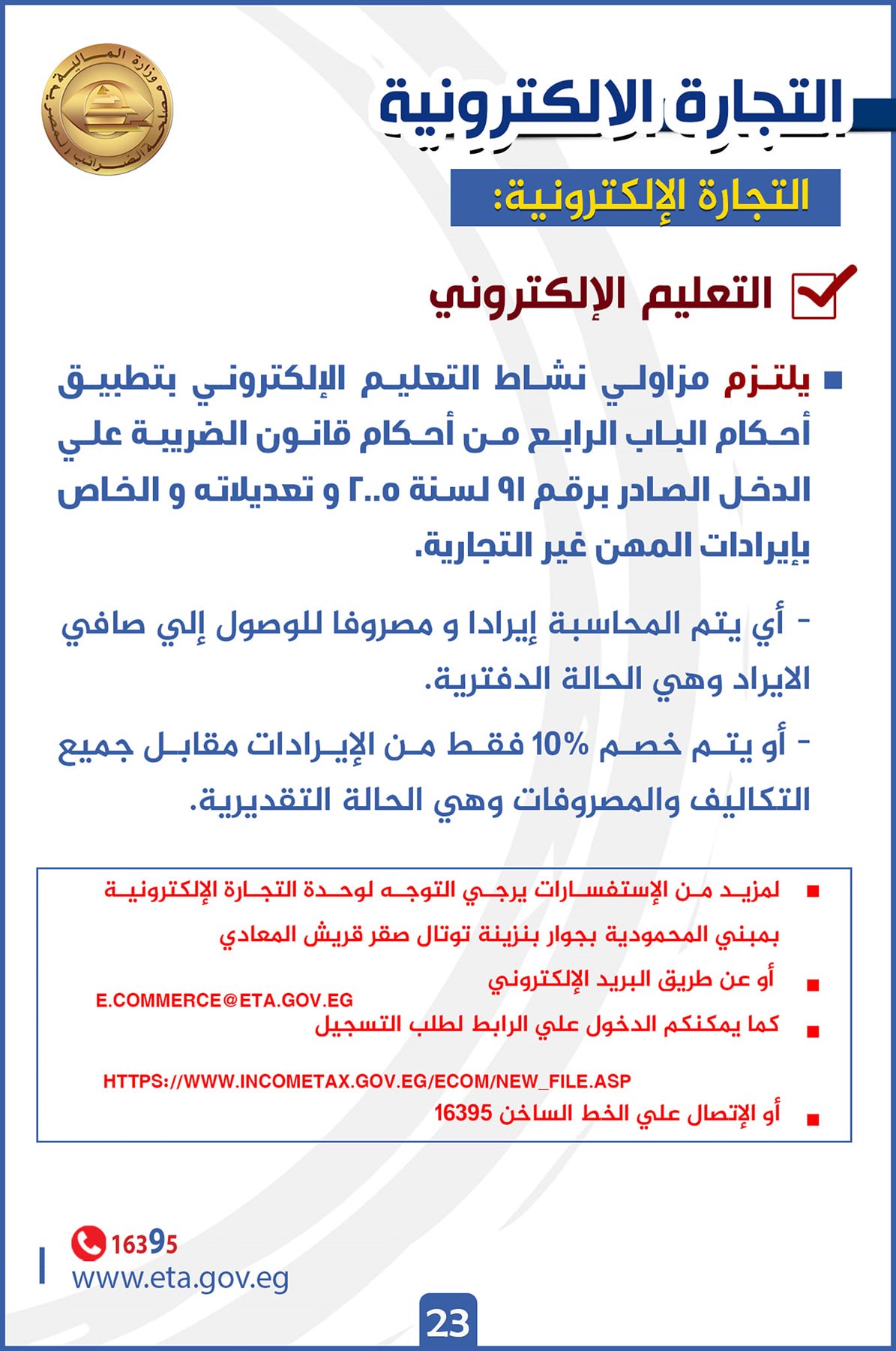 طالبت مصلحة الضرائب المصرية، مزاولي نشاط التعليم الإلكتروني الالتزام بتطبيق أحكام الباب الرابع من أحكام قانون الضريبة على الدخل الصادر برقم 91 لسنة 2005 و تعديلاته و الخاص بإيرادات المهن غير التجارية.