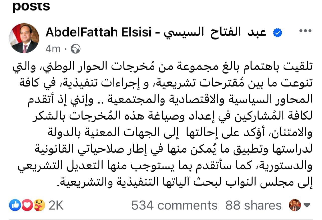 قال الرئيس عبد الفتاح السيسى ، " تلقيت باهتمام بالغ مجموعة من مُخرجات الحوار الوطني، والتي تنوعت ما بين مُقترحات تشريعية، و إجراءات تنفيذية، في كافة المحاور السياسية والاقتصادية والمجتمعية .