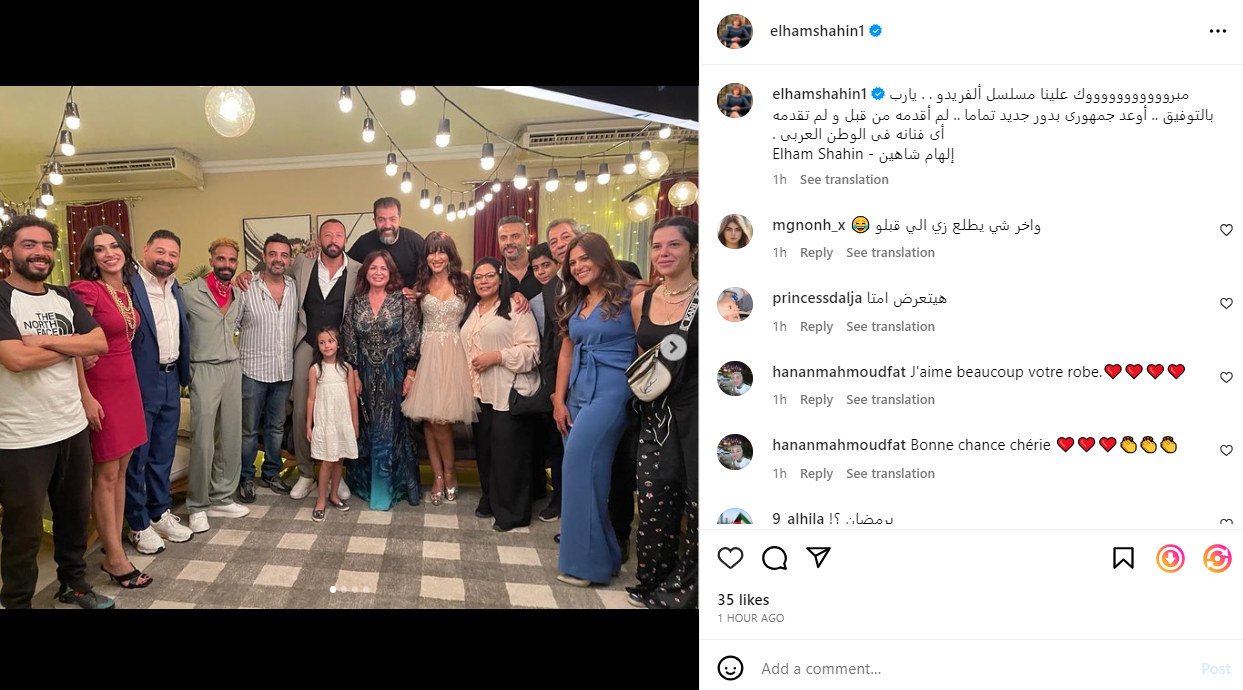 وكتبت إلهام شاهين عبر حسابها الشخصي على موقع التواصل الاجتماعي "إنستجرام" قائلة: "مبروك علينا مسلسل ألفريدو.. يارب بالتوفيق.. أوعد جمهوري بدور جديد تماما.. لم أقدمه من قبل ولم تقدمه أي فنانة في الوطن العربي".
