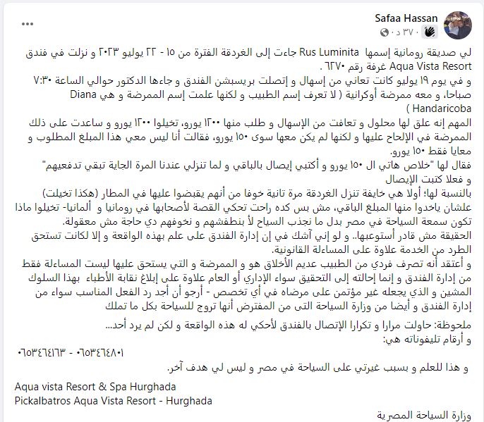 وقالت الفتاة،" لي صديقة رومانية إسمها Rus Luminita جاءت إلى الغردقة الفترة من 15 - 22 يوليو 2023 و نزلت في فندق Aqua Vista Resort غرفة رقم 6270 .و في يوم 19 يوليو كانت تعاني من إسهال و إتصلت بريسبشن الفندق و جاءها الدكتور حوالي الساعة ٧:٣٠ صباحا، و معه ممرضة أوكرانية ( لا تعرف إسم الطبيب و لكنها علمت إسم الممرضة و هي Diana Handaricoba )المهم إنه علق لها محلول و تعافت من الإسهال و طلب منها 1200 يورو، تخيلوا 1200 يورو و ساعدت على ذلك الممرضة في الإلحاح عليها و لكنها لم يكن معها سوى 150 يورو، فقالت أنا ليس معي هذا المبلغ المطلوب و معايا فقط 150 يورو.