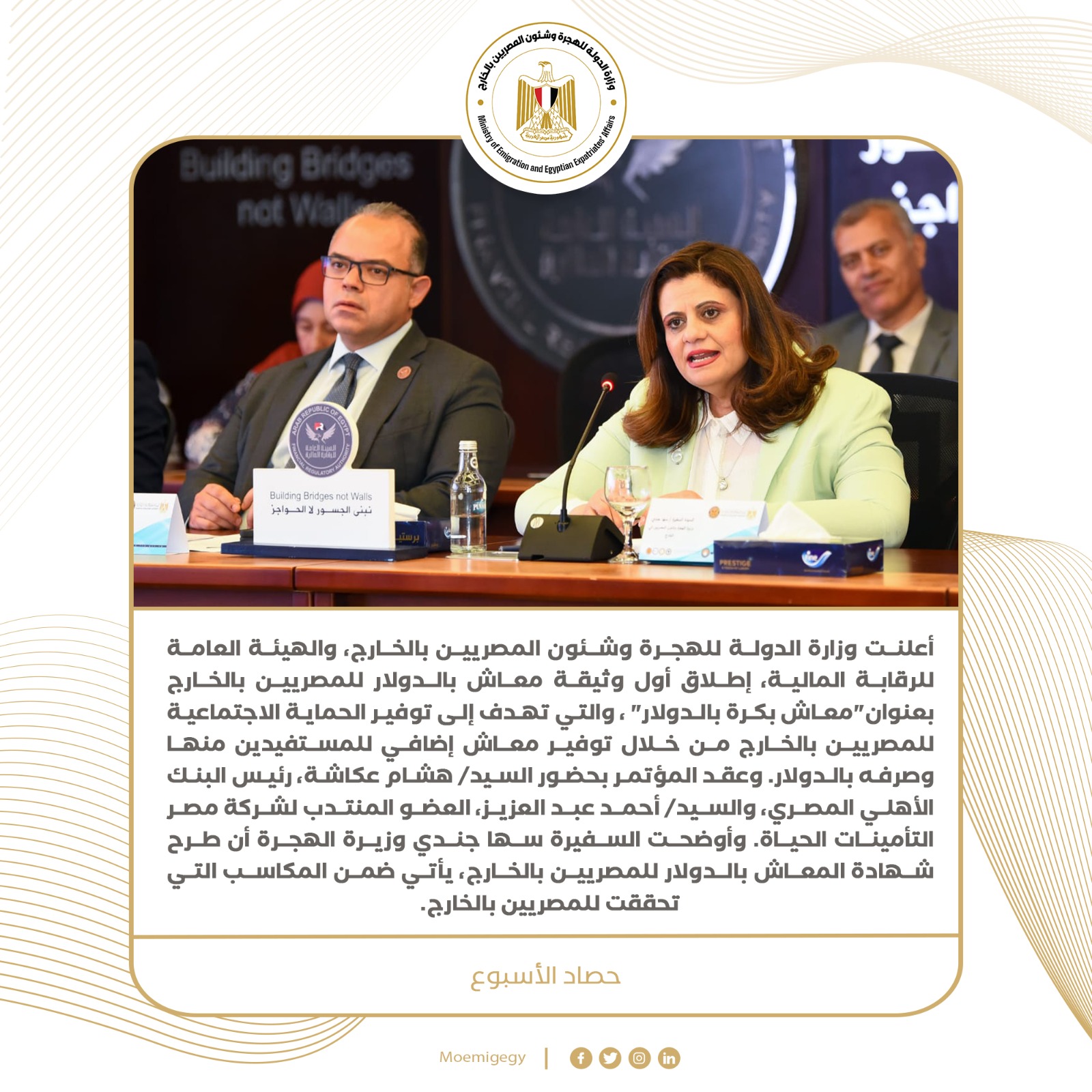 أعلنت وزارة الدولة للهجرة وشئون المصريين بالخارج، والهيئة العامة للرقابة المالية، إطلاق أول وثيقة معاش بالدولار للمصريين بالخارج بعنوان"معاش بكرة بالدولار" ، والتي تهدف إلى توفير الحماية الاجتماعية للمصريين بالخارج من خلال توفير معاش إضافي للمستفيدين منها وصرفه بالدولار. وعقد المؤتمر بحضور السيد/ هشام عكاشة، رئيس البنك الأهلي المصري، والسيد/ أحمد عبد العزيز، العضو المنتدب لشركة مصر التأمينات الحياة. وأوضحت السفيرة سها جندي وزيرة الهجرة أن طرح شهادة المعاش بالدولار للمصريين بالخارج، يأتي ضمن المكاسب التي تحققت للمصريين بالخارج، والتي ناقشنا الكثير منها خلال النسخة الرابعة من مؤتمر المصريين بالخارج، والتي ناقشت استراتيجيات إتاحة شهادات معاش وضمان اجتماعي للمصريين بالخارج.