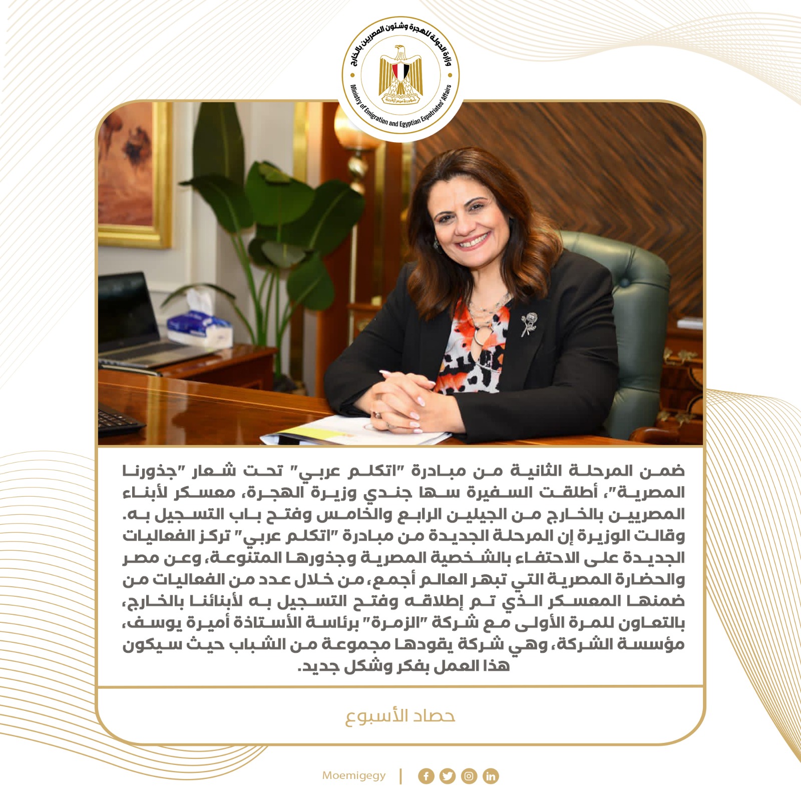 10) ضمن المرحلة الثانية من مبادرة "اتكلم عربي" تحت شعار "جذورنا المصرية"، أطلقت السفيرة سها جندي وزيرة الهجرة، معسكر لأبناء المصريين بالخارج من الجيلين الرابع والخامس وفتح باب التسجيل به. وقالت الوزيرة إن المرحلة الجديدة من مبادرة "اتكلم عربي" تركز الفعاليات الجديدة على الاحتفاء بالشخصية المصرية وجذورها المتنوعة، وعن مصر والحضارة المصرية التي تبهر العالم أجمع، من خلال عدد من الفعاليات من ضمنها المعسكر الذي تم إطلاقه وفتح التسجيل به لأبنائنا بالخارج، بالتعاون للمرة الأولى مع شركة "الزمرة" برئاسة الأستاذة أميرة يوسف، مؤسسة الشركة، وهي شركة يقودها مجموعة من الشباب حيث سيكون هذا العمل بفكر وشكل جديد.
