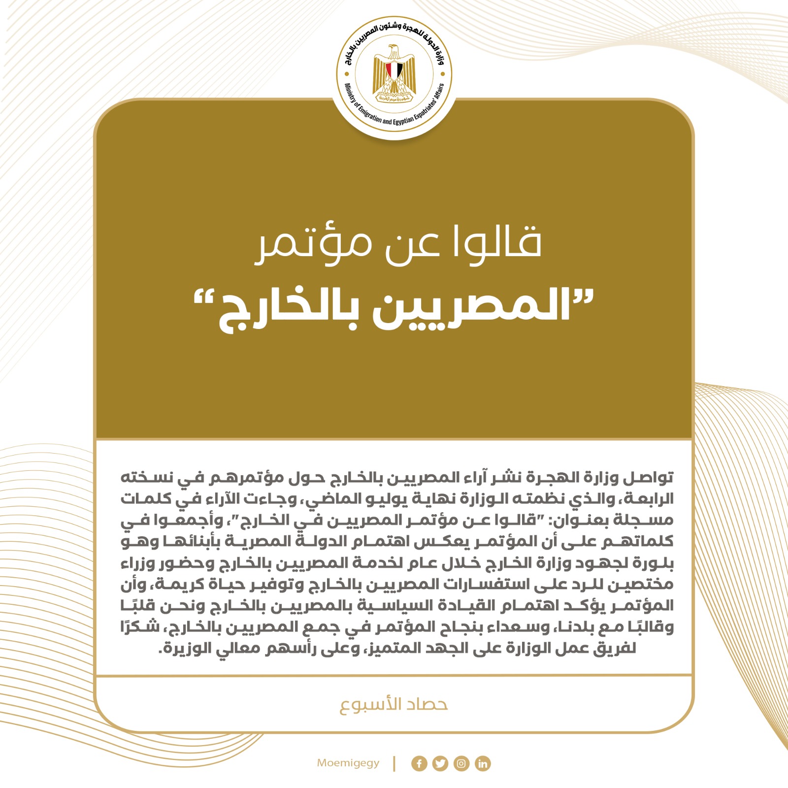 13) تواصل وزارة الهجرة نشر آراء المصريين بالخارج حول مؤتمرهم في نسخته الرابعة، والذي نظمته الوزارة نهاية يوليو الماضي، وجاءت الآراء في كلمات مسجلة بعنوان: "قالوا عن مؤتمر المصريين في الخارج"، وأجمعوا في كلماتهم على أن المؤتمر يعكس اهتمام الدولة المصرية بأبنائها وهو بلورة لجهود وزارة الخارج خلال عام لخدمة المصريين بالخارج وحضور وزراء مختصين للرد على استفسارات المصريين بالخارج وتوفير حياة كريمة، وأن المؤتمر يؤكد اهتمام القيادة السياسية بالمصريين بالخارج ونحن قلبًا وقالبًا مع بلدنا، وسعداء بنجاح المؤتمر في جمع المصريين بالخارج، شكرًا لفريق عمل الوزارة على الجهد المتميز، وعلى رأسهم معالي الوزيرة.
