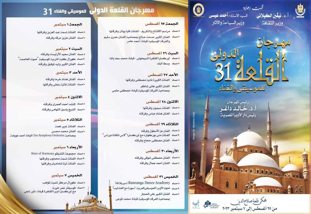 ومن جانبه أكد الدكتور خالد داغر، رئيس دار الأوبرا، أن الدورة 31 من مهرجان قلعة صلاح الدين الدولى للموسيقى والغناء، ستمثل نقلة نوعية في تاريخ المهرجان، وذلك بعد تطويره بدعم كبير من معالي وزيرة الثقافة، الدكتورة نيڤين الكيلاني، ليتسع لأشكال وألوان موسيقية متعددة، تهدف إلى انعكاس رحابة الموسيقى، وتلاقيها مع كافة الأذواق والثقافات والشرائح العمرية المختلفة.
