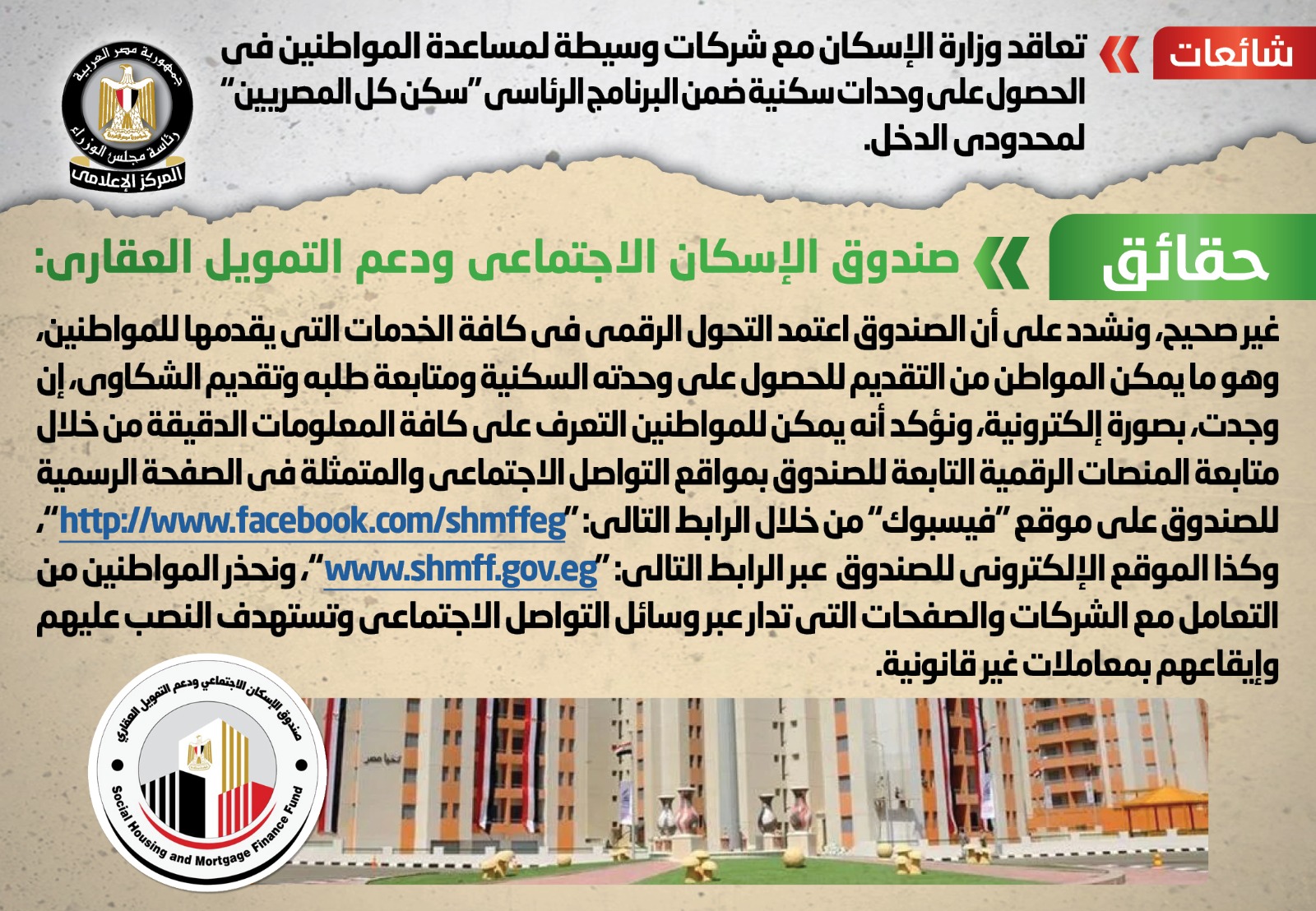 قام المركز الإعلامي لمجلس الوزراء بالتواصل مع صندوق الإسكان الاجتماعي ودعم التمويل العقاري، والذي نفى تلك الأنباء، مُؤكداً أنه لا صحة للتعاقد مع شركات وسيطة لمساعدة المواطنين في الحصول على وحدات سكنية ضمن البرنامج الرئاسي "سكن كل المصريين" لمحدودي الدخل، مشدداً على أن الصندوق اعتمد التحول الرقمي في كافة الخدمات التي يقدمها للمواطنين، وهو ما يمكن المواطن من التقديم للحصول على وحدته السكنية ومتابعة طلبه وتقديم الشكاوى، إن وجدت، بصورة إلكترونية، مؤكداً أنه يمكن للمواطنين التعرف على كافة المعلومات الدقيقة من خلال متابعة المنصات الرقمية التابعة للصندوق بمواقع التواصل الاجتماعي والمتمثلة في الصفحة الرسمية للصندوق على موقع "فيسبوك" من خلال الرابط التالي:"http://www.facebook.com/shmffeg"، وكذا الموقع الإلكتروني للصندوق عبر الرابط التالي: "www.shmff.gov.eg"، مُحذراً المواطنين من التعامل مع الشركات والصفحات التي تدار عبر وسائل التواصل الاجتماعي وتستهدف النصب عليهم وإيقاعهم بمعاملات غير قانونية.