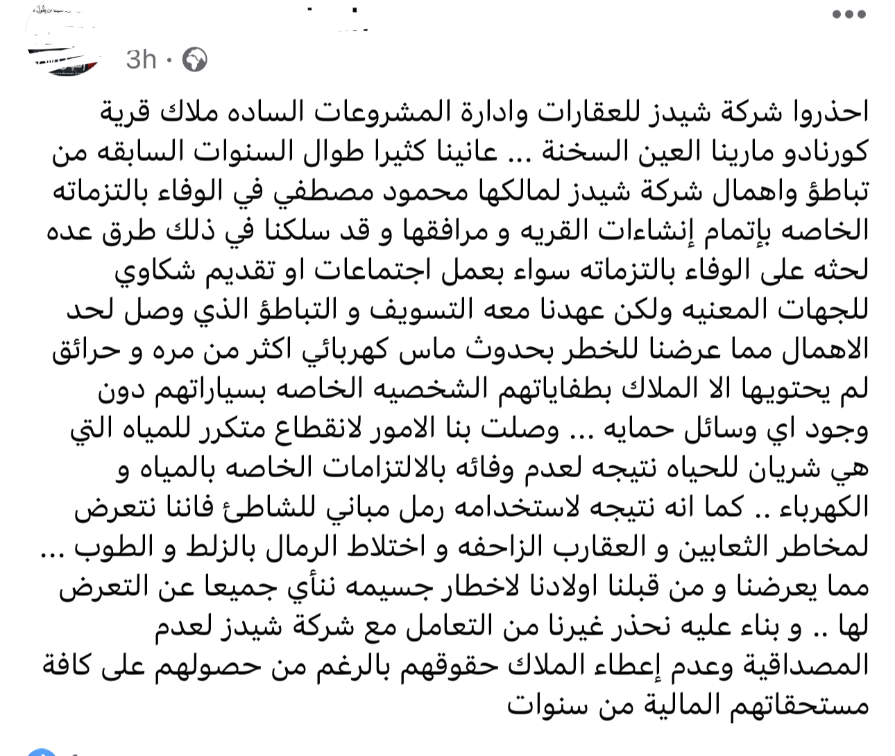 وقالت عن شركة شيدز،"وصلت بنا الامور لانقطاع متكرر للمياه التي هي شريان للحياه نتيجه لعدم وفائه بالالتزامات الخاصه بالمياه والكهرباء .. كما انه نتيجه لاستخدامه رمل مباني للشاطئ فاننا نتعرض لمخاطر الثعابين و العقارب الزاحفه و اختلاط الرمال بالزلط و الطوب... مما يعرضنا و من قبلنا اولادنا لاخطار جسيمه ننأي جميعا عن التعرض لها .. و بناء عليه نحذر غيرنا من التعامل مع شركة شيدز لعدمالمصداقية وعدم إعطاء الملاك حقوقهم بالرغم من حصولهم على كافة مستحقاتهم المالية من سنوات".