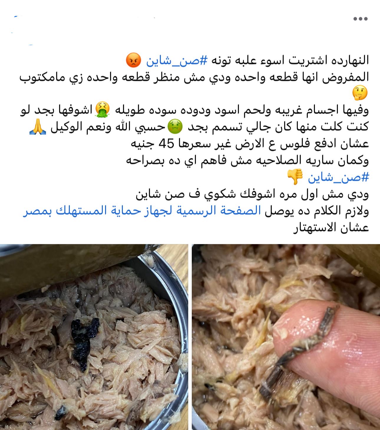 وقال صاحب المشكلة،" النهارده اشتريت اسوء علبه تونه صن شاين المفروض انها قطعه واحده ودي مش منظر قطعه واحده زي مامكتوب وفيها اجسام غريبه ولحم اسود ودوده سوده طويله اشوفها بجد لو كنت كلت منها كان جالي تسمم بجد حسبي الله ونعم الوكيل عشان ادفع فلوس ع الارض غير سعرها 45 جنيه وكمان ساريه الصلاحيه مش فاهم اي ده بصراحه