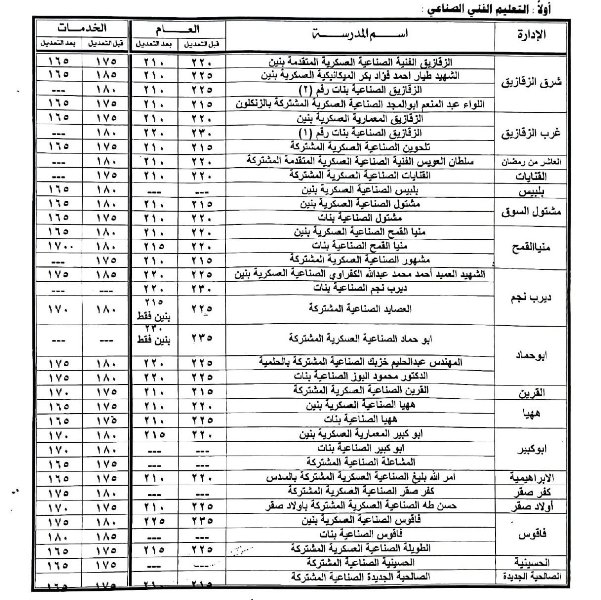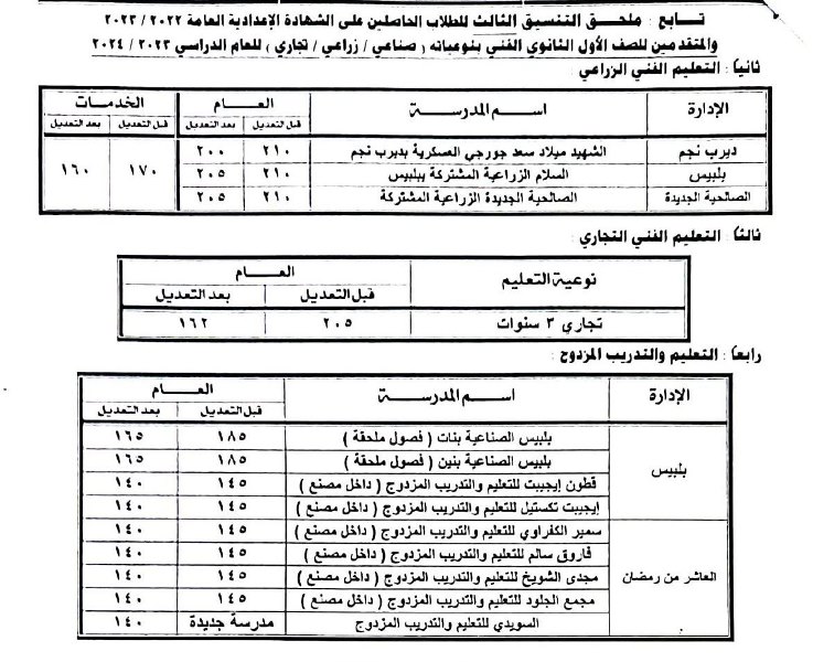 قرر الدكتور ممدوح غراب محافظ الشرقية، النزول بالحد الأدنى لتنسيق القبول بالمرحلة الثانوية للتعليم الفني للعام الدراسي 2023 /2024 م وذلك للناجحين في الشهادة الإعدادية العامة للعام الدراسي 2022 / 2023 لكل نوعية من نوعيات التعليم الفني (صناعي – زراعي – تجاري) والتعليم والتدريب المزدوج طبقا للكشوف المرفقة.