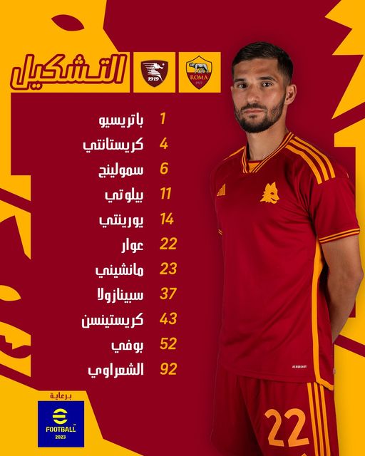 التشكيل الرسمي لنادي روما أمام ساليرنيتانا بالدوري الأيطالي