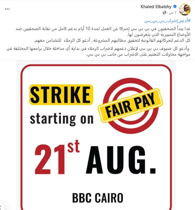 أعلن خالد البلشي، نقيب الصحفيين أن اليوم الإثنين يبدأ الصحفيون في بي بي سي مصر إضرابًا عن العمل لمدة 10 أيام بدعم كامل من نقابة الصحفيين ضد الأوضاع التمييزية التي يتعرضون لها.