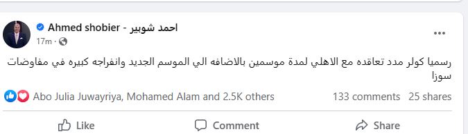 وكتب شوبير عبر حسابه على "فيس بوك"، "رسميا كولر مدد تعاقده مع الأهلي لمدة موسمين، بالإضافة إلى الموسم الجديد، وانفراجة كبيرة فى مفاوضات سوزا".