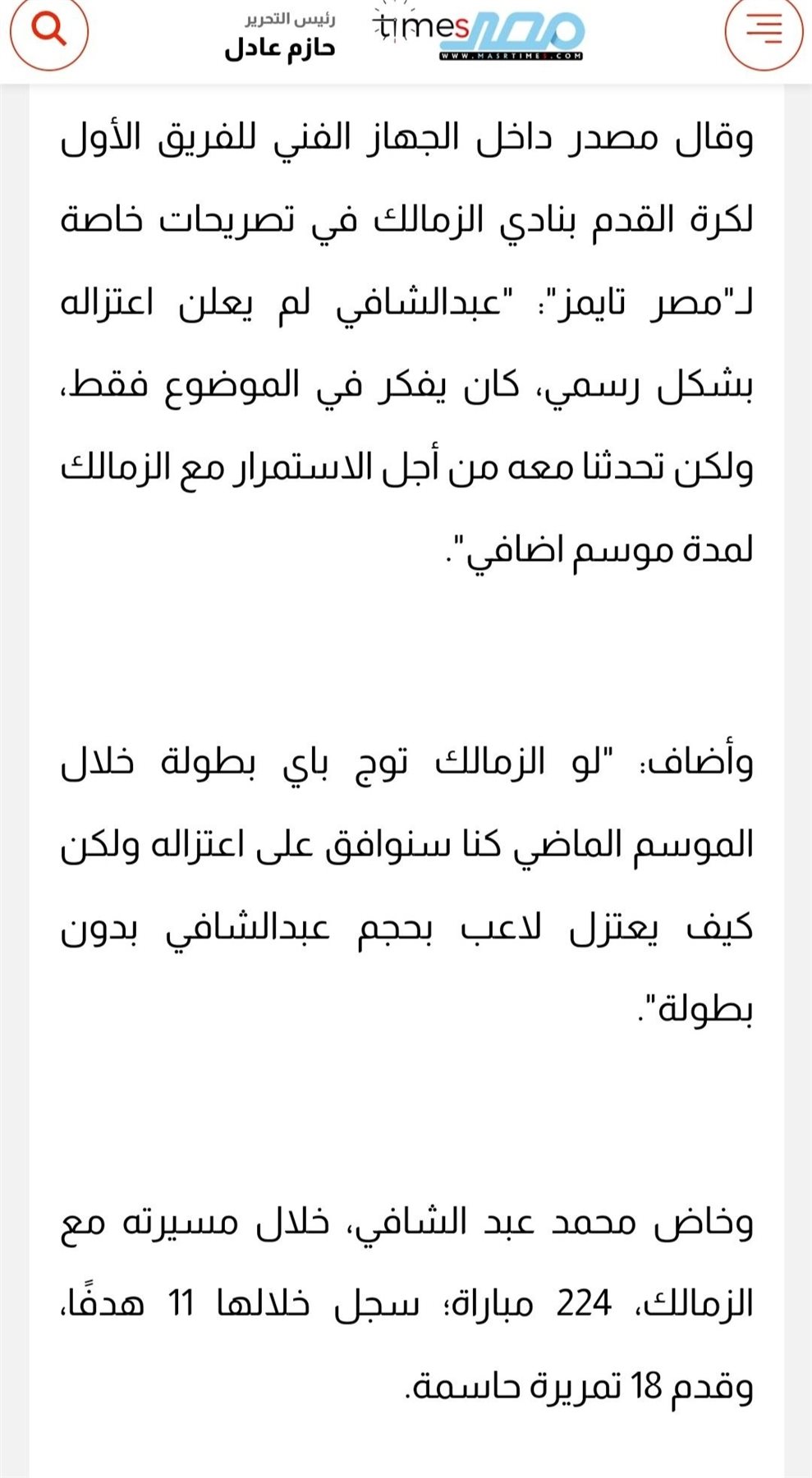 وقال مصدر داخل الجهاز الفني للفريق الأول لكرة القدم بنادي الزمالك في تصريحات خاصة لـ"مصر تايمز": "عبدالشافي لم يعلن اعتزاله بشكل رسمي، كان يفكر في الموضوع فقط، ولكن تحدثنا معه من أجل الاستمرار مع الزمالك لمدة موسم اضافي".
