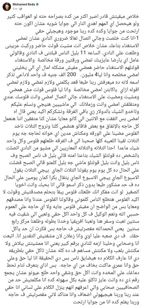 واستكمل، "مصدقتيش وقولت لا اكيد الفلوس هتطلع الناس كلموني وقالولنا الفلوس عندنا وانا مصدقهم ومعايا بس من الواضح ان مفيش فلوس جايه ولا اي حاجه علي العموم حسبي الله ونعم الوكيل ف كل واحد اكل حقي وتعبي الي شقيت فيه سنتين تعبت وسفر هنا ولعبنا افريقيا وخدنا بطوله وطلعنا مركز رابع سنتين يعني الحمدالله مقصرتيش ف حاجه بس فكرت ان حد ياكل حقك في دي صعبه عليا اوي وانا زعلان لان مشفتيش التقدير انا. اتبعت انا وصحابي وحلينا ازمه للنادي برقم كبير يعني انا ممشيتش ببلاش ولا مكنتش بلعب ولا مكنتش مساهم ف ده كله عشان تاكل حقي بلطريقه دي انا عارف الكلام ده هيضايق ناس بس دي الحقيقة انا ليا حق وعلي حق وانا عمري ماكنت بخاف من اي حاجة".