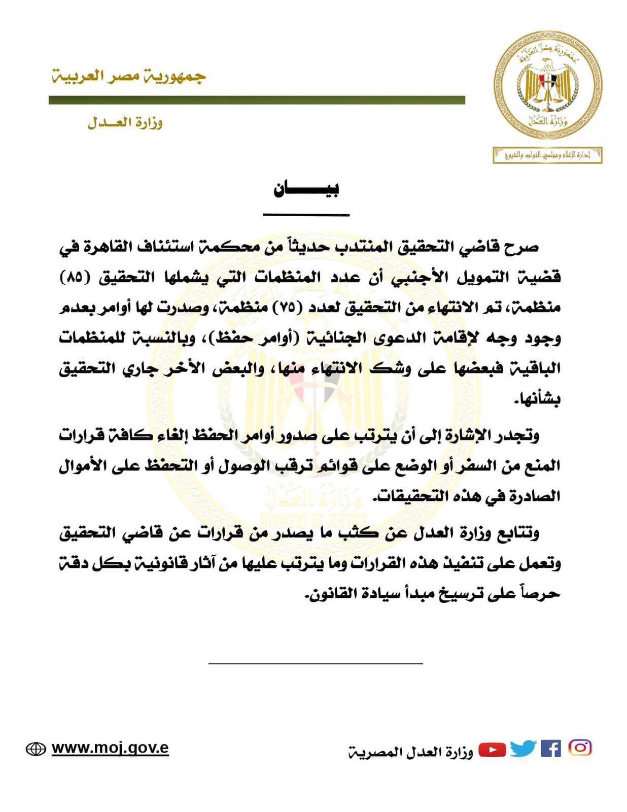 وتابع القاضي في بيان صادر من وزارة العدل، أنه بالنسبة للمنظمات الباقية فبعضها على وشك الانتهاء منها، والبعض الأخر جاري التحقيق بشأنها.