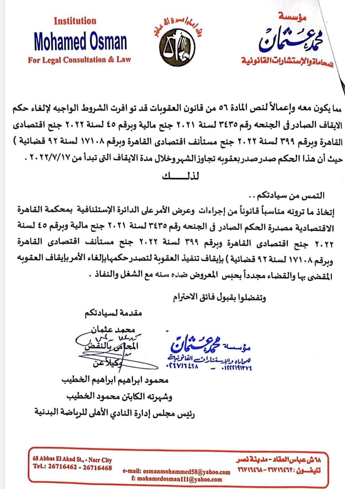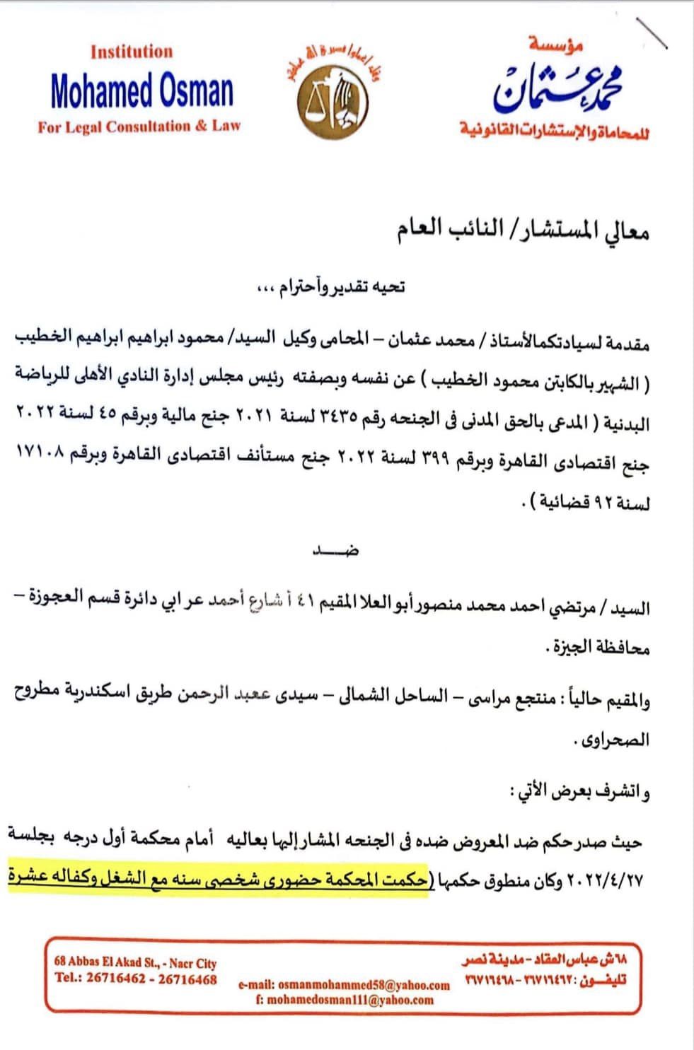 النص الكامل لطلب الأهلي بتنفيذ حكم حبس مرتضى منصور لمدة سنة بخلاف الـ 6 أشهر (مستند)