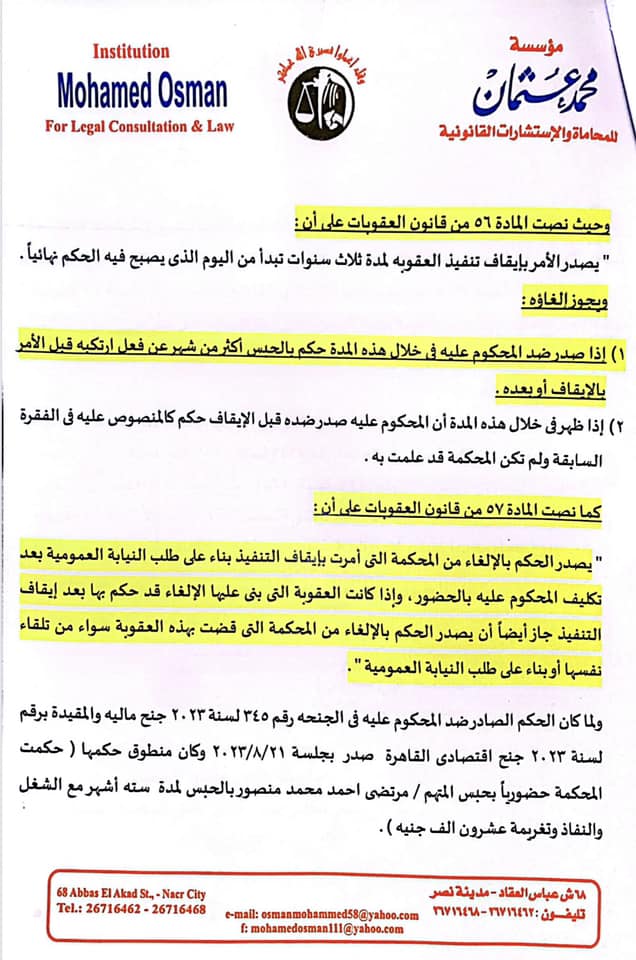حصل "مصر تايمز" على النص الكامل للطلب المقدم من المحامى الكبير محمد عثمان، المستشار القانوني للنادي الأهلي، للمستشار حمادة الصاوي النائب العام، والذى يطالب خلاله بتنفيذ الحكم الصادر ضد مرتضى منصور رئيس نادي الزمالك السابق، بحبسه في القضيه رقم 45 لسنة2021 جنح إقتصاديه القاهره والقاضى بحبسه (سنه حبس مع ايقاف التنفيذ لمده ثلاث سنوات) .