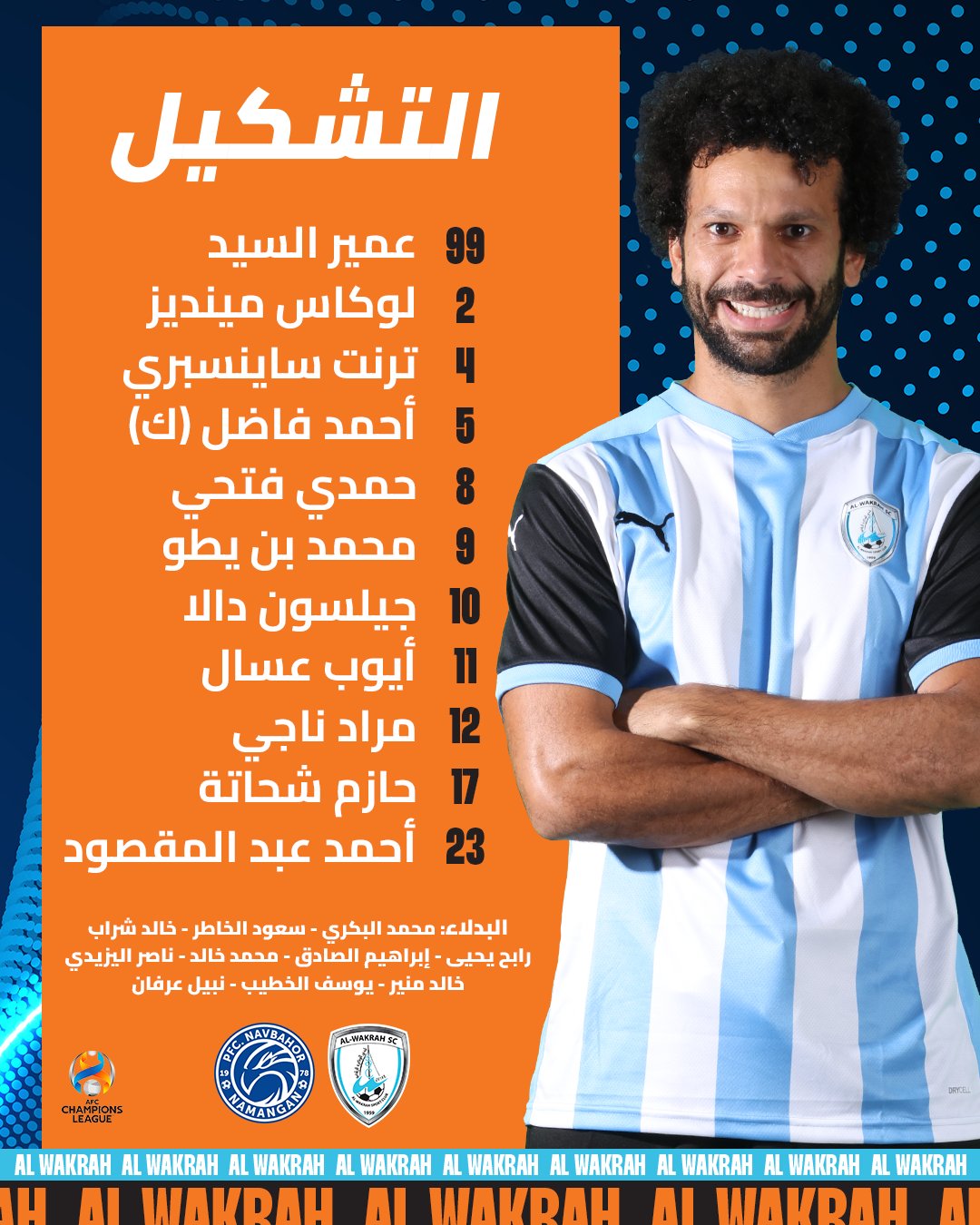 أعلن ماركيز لوبيز مدرب فريق الوكرة القطري المحترف ضمن صفوفه حمدي فتحي لاعب منتخبنا الوطني، التشكيل الرسمي لمواجهة نافباخور في إطار منافسات المباراة الفاصلة المؤهلة لبطولة دوري أبطال آسيا.