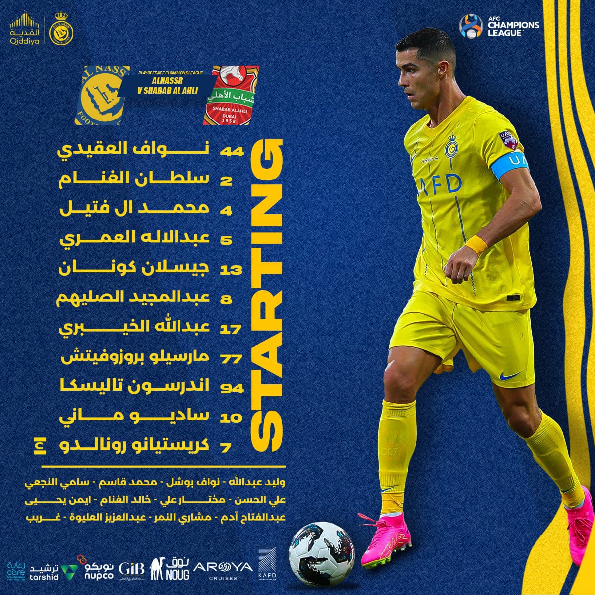 وشهد تشكيل النصر لمواجهة شباب الأهلي في دوري أبطال آسيا، تواجد النجم البرتغالي كريستيانو رونالدو والسنغالي سادو ماني، بالإضافة إلى لاعب الوسط الكرواتي مارسيلو بروزوفيتش.