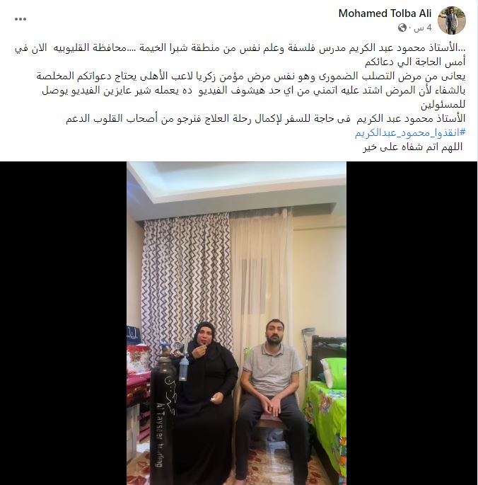 استغاث مدرس فلسفة بمنطقة شبرا الخيمة بالمسئولين لمساعدته فى العلاج من مرض الضمور وهو نفس مرض اللاعب المصرى مؤمن زكريا.