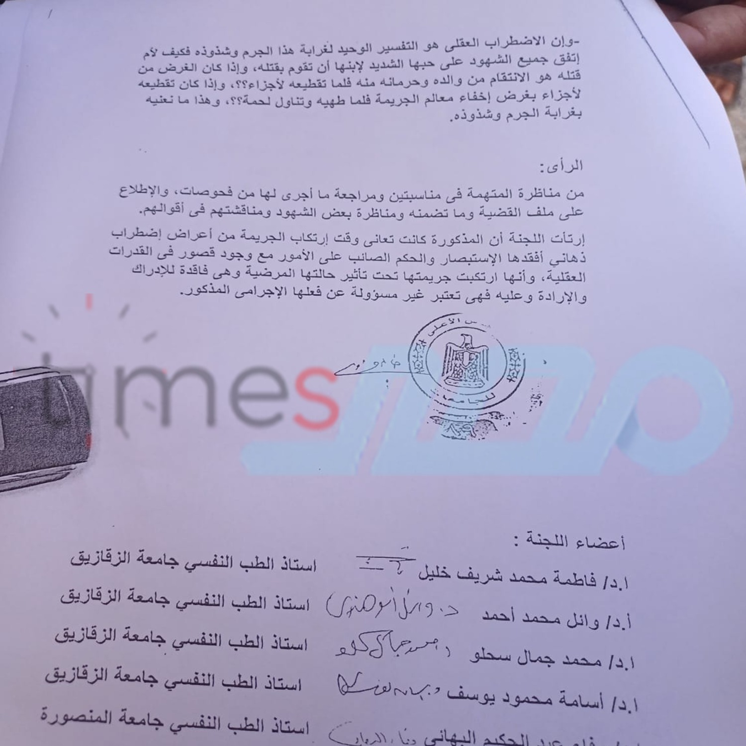حصل “ مصر تايمز” على صورة من التقرير الطبي ورأى اللجنة الخماسية الخاص بـ"سيدة فاقوس" المتهمة بقتل نجلها وتقطيع جثته لأجزاء وأكل أجزاء منها في الشرقية.