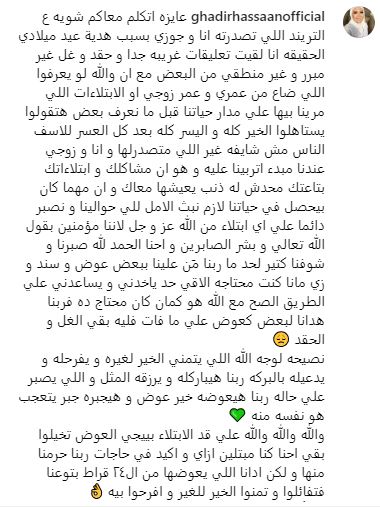 ردت الإعلامية غدير حسان، على الانتقادات التي وجهت لها بعد أن أهداها زوجها سيارة ماركة مرسيدس في عيد ميلادها، مؤكدة على أنهما مرا بابتلاءات عديدة.