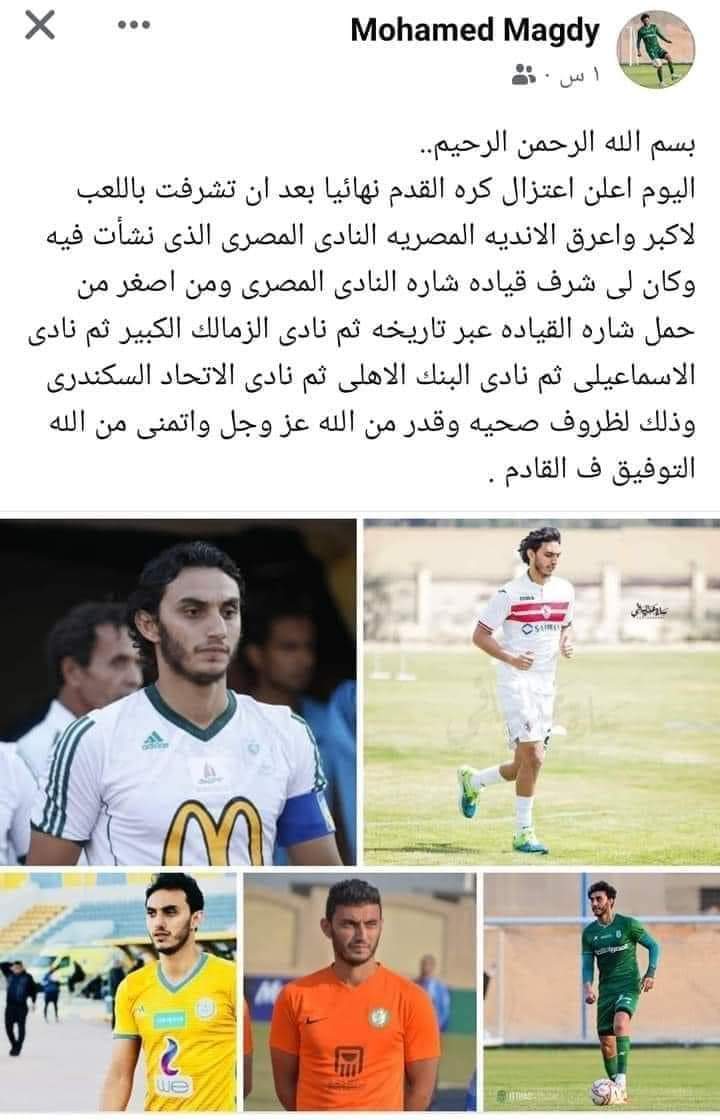 أعلن محمد مجدي، مدافع الزمالك والمصرى البورسعيدي سابقاً، اعتزاله كرة القدم، لظروف صحية، حيث كتب مجدي عبر حسابه الرسمي على موقع التواصل الاجتماعي فيس بوك: "اليوم أعلن اعتزالي كرة القدم نهائيا بعد ان تشرفت باللعب لأكبر وأعرق الأندية المصرية النادي المصري الذي نشأت فيه".