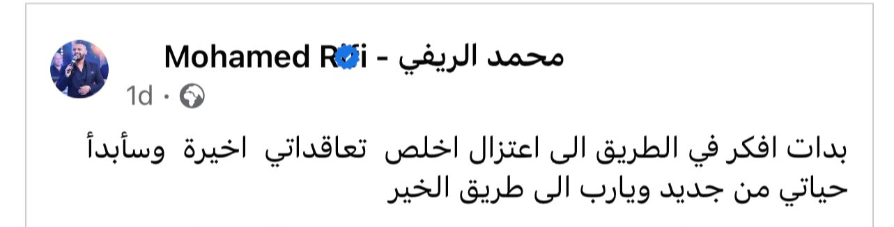 وكتب محمد الريفي، عبر صفحته على موقع التواصل الإجتماعي “الفيسلوك” قائلا: “بدأت أفكر في الطريق إلى الاعتزال.. اخلص تعاقداتي الأخيرة وسأبدأ حياتي من جديد وياربي إلى طريق الخير”.