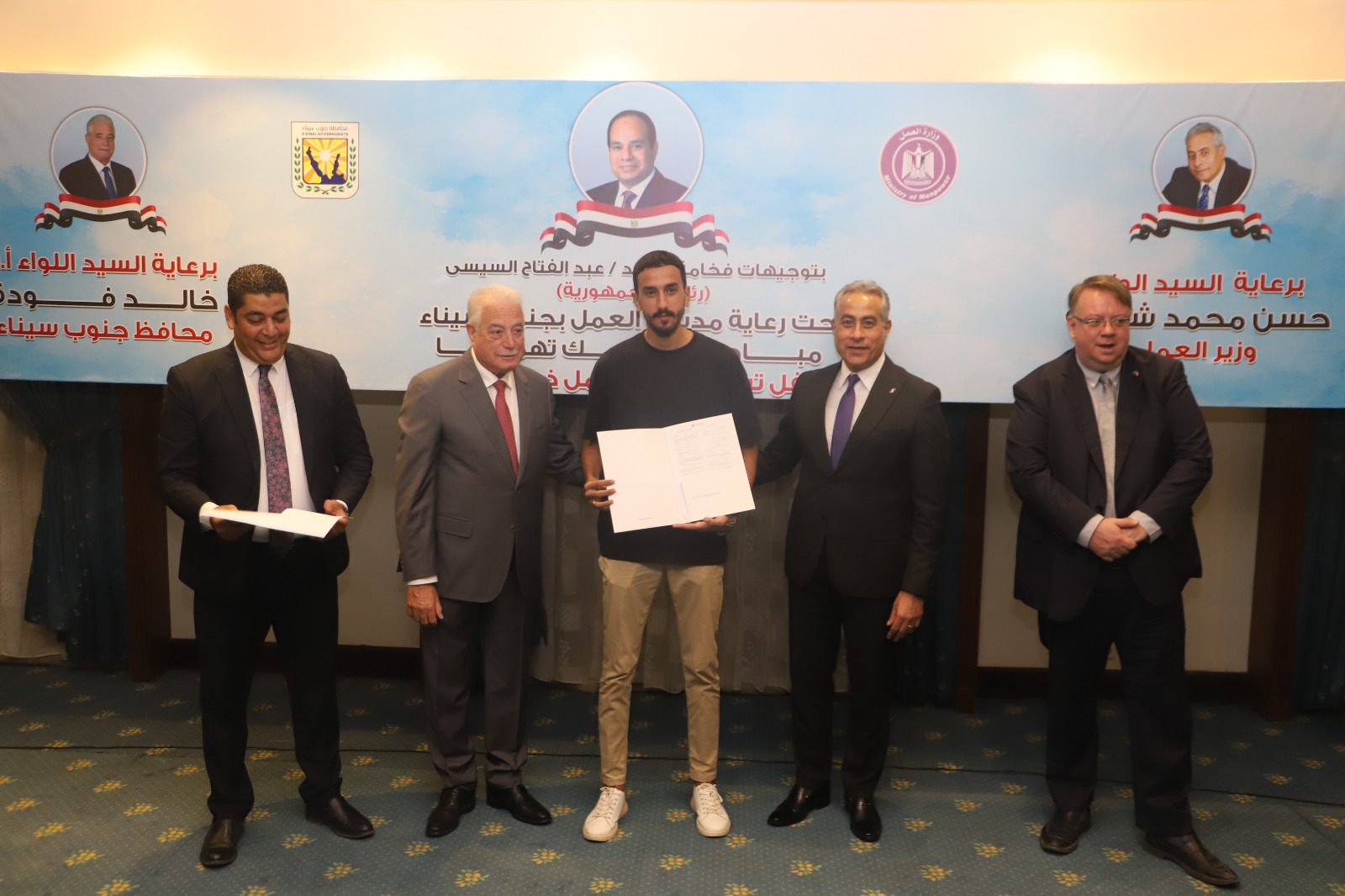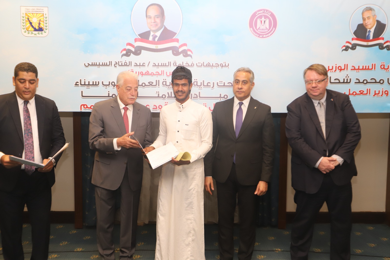 حضر فعاليات الإطلاق،وتسليم العقود التدريبية من وزارة العمل : إيهاب عبد العاطي المستشار القانوني للوزارة ، ومنال عبد العزيز رئيس الإدارة المركزية لشئون مكتب الوزير ،وعبد الوهاب خضر المتحدث الرسمي والمستشار الإعلامي للوزارة، ود.رشا عبد الباسط رئيس الإدارة المركزية للعلاقات الخارجية وشئون المصريين بالخارج ، وغادة إبراهيم رئيس الإدارة المركزية للسلامة والصحة المهنية وتأمين بيئة العمل،وأحمد إسماعيل مدير عام الإدارة العامة لشئون المديريات،وأحمد معروف مدير عام الإدارة العامة للعلاقات العامة،وكريمة عبد الرحمن مديرعام الإدارة العامة لتراخيص عمل الأجانب،ونشوى الشبكي مدير عام حسابات العمالة غير المنتظمة،وشيماء محمود مدير عام الإدارة العامة للمتابعة والتقييم،وأشرف علم الدين مدير مديرية العمل بجنوب سيناء، ومحمد عليان وكيل مديرية العمل بمحافظة القليوبية..ومن محافظة جنوب سيناء : اللواء خالد متولي مستشارالمحافظ للعلاقات الدولية، واللواء محمد شعير سكرتير العام المساعد للمحافظة ، واللواء رماح هاشم رئيس مدينة شرم الشيخ،وأشرف علم الدين مدير مدير عمل جنوب سيناء..