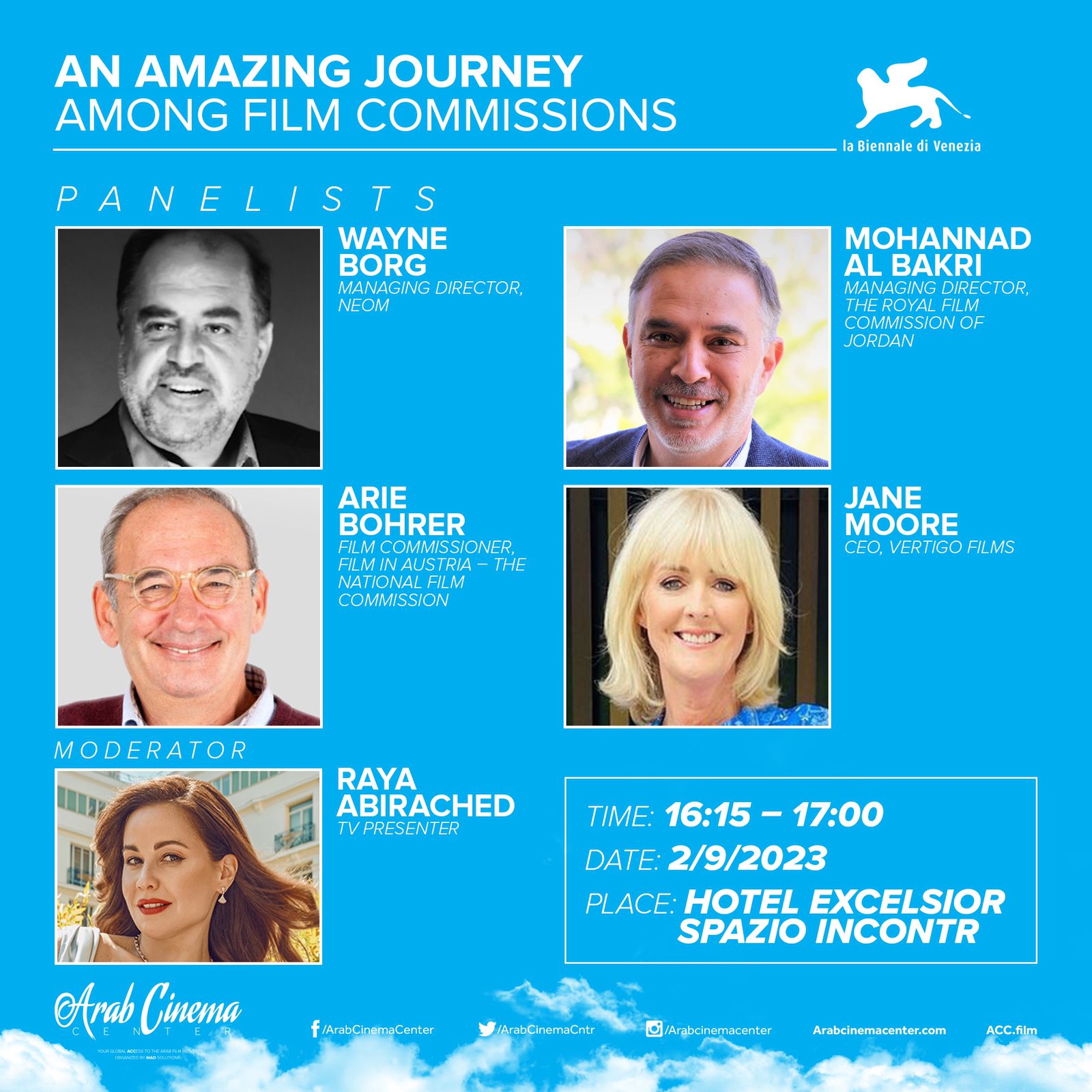 تقام حلقة النقاش الأولى تحت عنوان رحلة مدهشة بين مفوضيات رعاية السينما ويشارك فيها كل من واين بورغ (المدير العام، نيوم)، ومهند البكري (المدير التنفيذي، الهيئة الملكية الأردنية للأفلام)، آري بوهرر (مفوض الأفلام، FILM in AUSTRIA المفوضية الوطنية للسينما)، وجين مور (الرئيس التنفيذي، شركة Vertigo Films). وتدير حلقة النقاش الإعلامية ومقدمة البرامج التلفزيونية اللبنانية الشهيرة ريا أبي راشد.