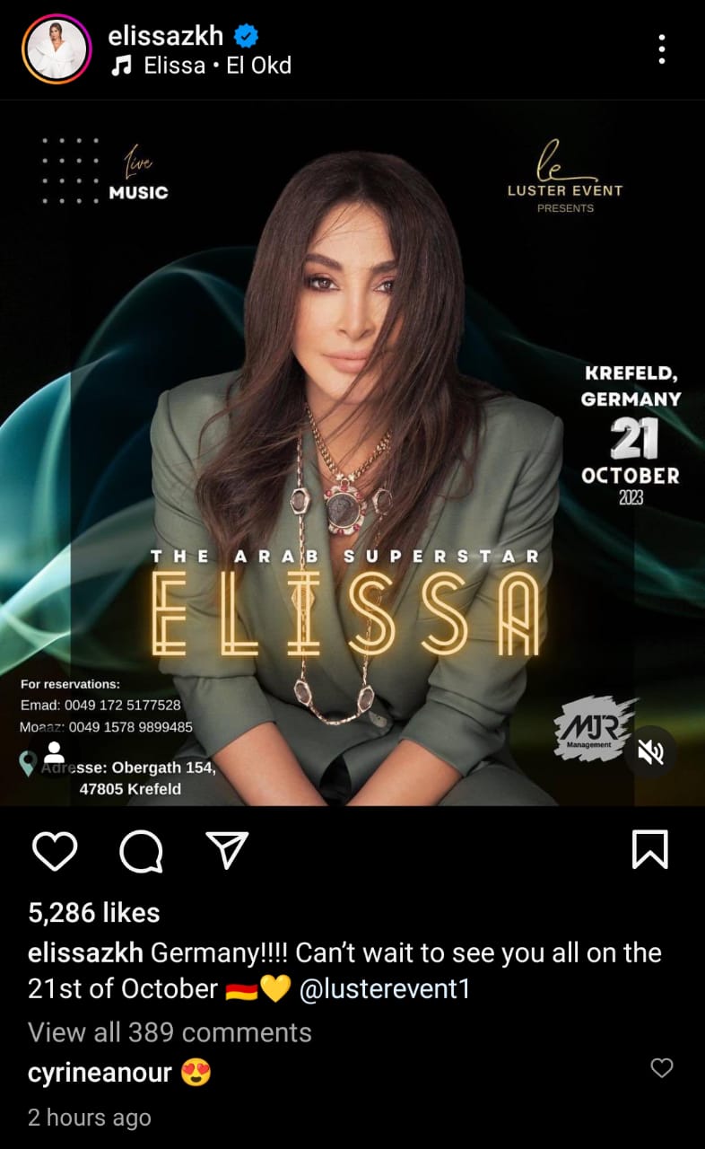 أعلنت المطربة اليسا عن حفل القادم، ومن المقرر إقامته في ألمانيا يوم 21 أكتوبر القادم، وذلك عبر موقع تبادل الصور والفيديوهات“ انستجرام "، وعلقت على بوستر الحفل قائلة:" لا أستطيع الانتظار لرؤيتكم جميعًا في ألمانيا يوم 21 أكتوبر".
