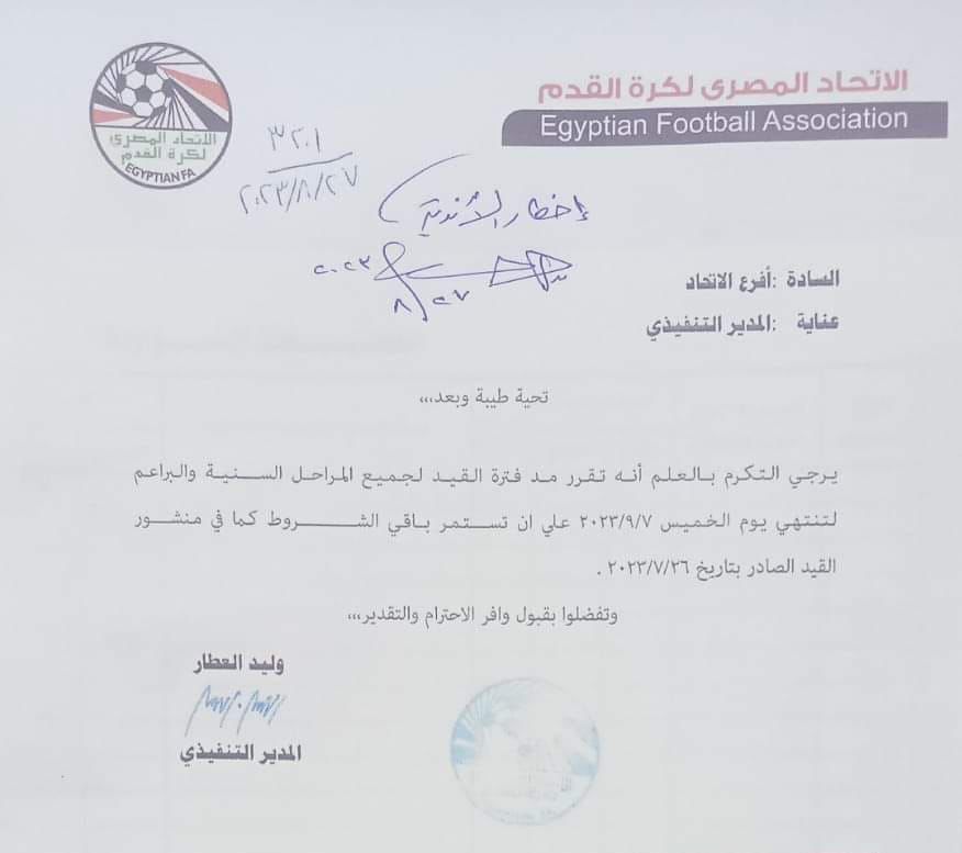 وأرسل اتحاد الكرة المصري خطابات إلى الفروع التابعة له قرارا بمد فترة القيد للقائمة الإضافية للمراحل السنية والبراعم إلى يوم 7 سبتمبر المقبل، بعد أن كان مقررا انتهاؤها في الأول من الشهر نفسه.