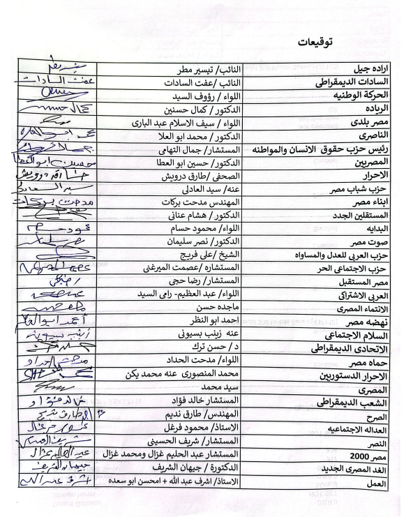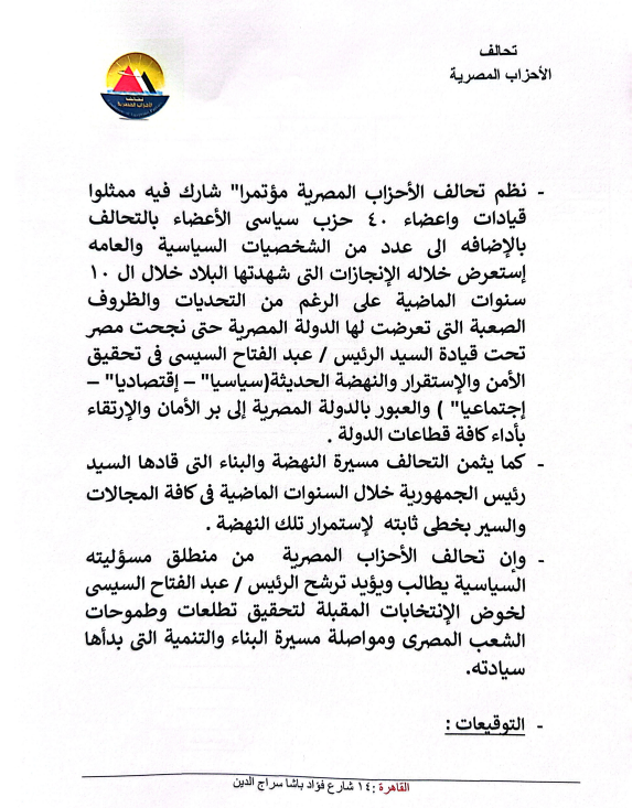 وإن تحالف الأحزاب المصرية من منطلق مسؤليته السياسية يطالب ويؤيد ترشح الرئيس عبد الفتاح السيسي لخوض الانتخابات المقبلة لتحقيق تطلعات وطموحات الشعب المصري ومواصلة مسيرة البناء والتنمية التى بدأها الرئيس المصري .