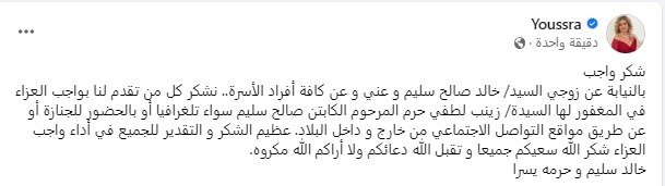 وقالت يسرا عبر صفحتها الشخصية على مواقع التواصل الاجتماعى " شكر واجب بالنيابة عن زوجي السيد/ خالد صالح سليم و عني و عن كافة أفراد الأسرة.. نشكر كل من تقدم لنا بواجب العزاء في المغفور لها السيدة/ زينب لطفي حرم المرحوم الكابتن صالح سليم سواء تلغرافيا أو بالحضور للجنازة أو عن طريق مواقع التواصل الاجتماعي من خارج و داخل البلاد. عظيم الشكر و التقدير للجميع في أداء واجب العزاء شكر الله سعيكم جميعا و تقبل الله دعائكم ولا أراكم الله مكروه.خالد سليم و حرمه يسرا".
