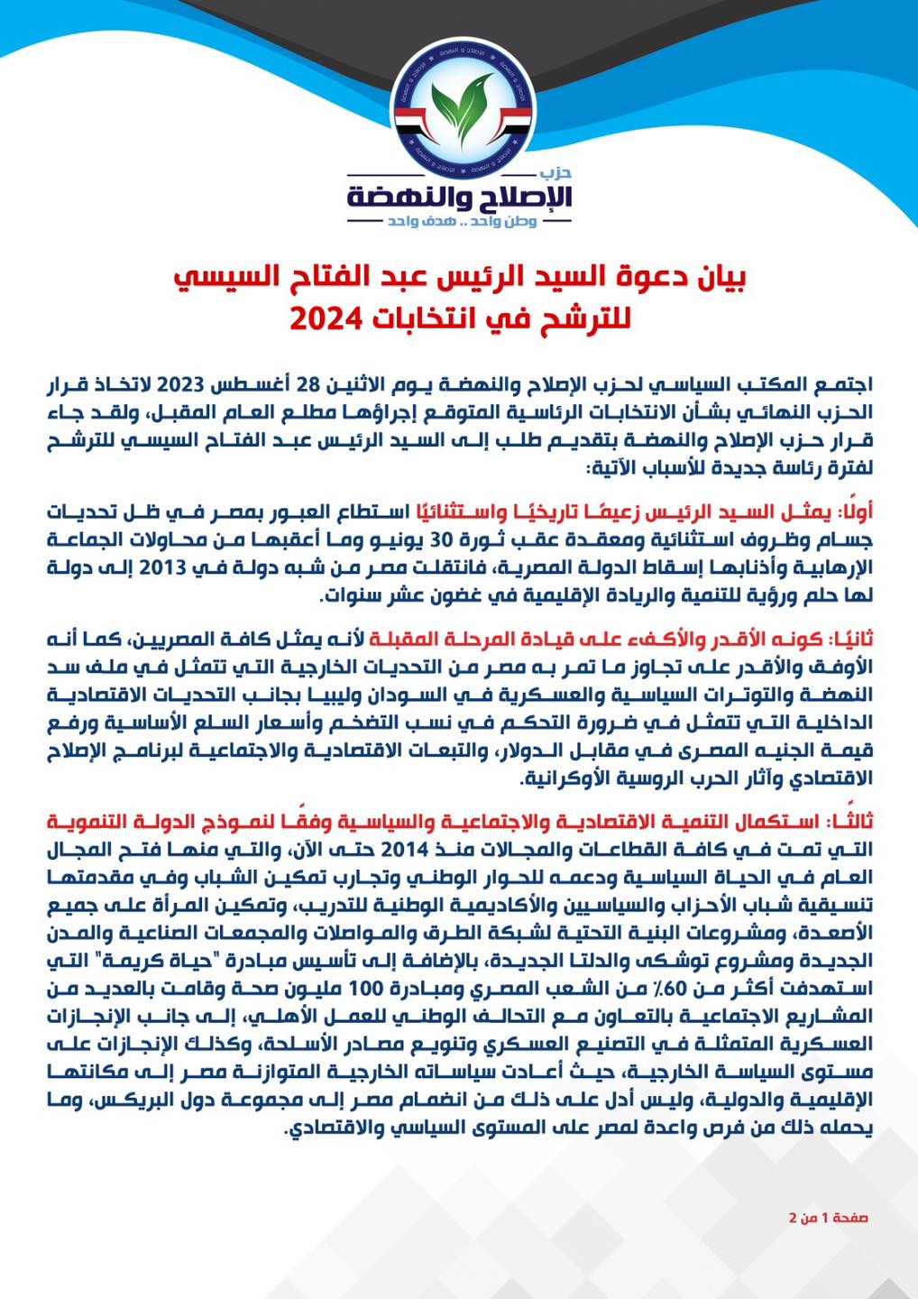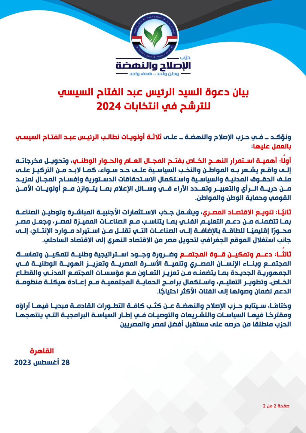 وجه المكتب السياسي لحزب الإصلاح والنهضة يوم الاثنين 28 أغسطس 2023، لاتخاذ قرار الحزب النهائي بشأن الانتخابات الرئاسية المتوقع إجراؤها مطلع العام المقبل، ولقد جاء قرار حزب الإصلاح والنهضة بتقديم طلب إلى السيد الرئيس عبد الفتاح السيسي للترشح لفترة رئاسة جديدة للأسباب الآتية: