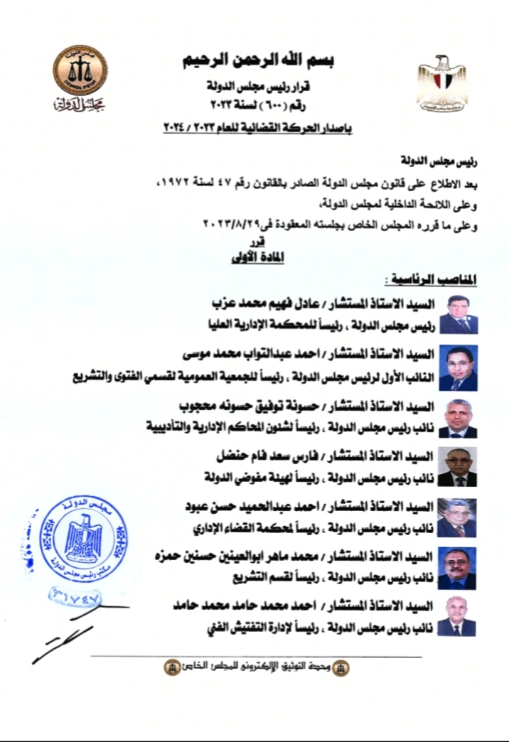 أصدر المستشار عادل فهيم محمد عزب، رئيس مجلس الدولة، القرار رقم 600 لسنة 2023، للحركة القضائية لعام 2023- 2024 بعد موافقة المجلس الخاص، وتضمن قرار رئيس مجلس الدولة بإصدار الحركة القضائية.