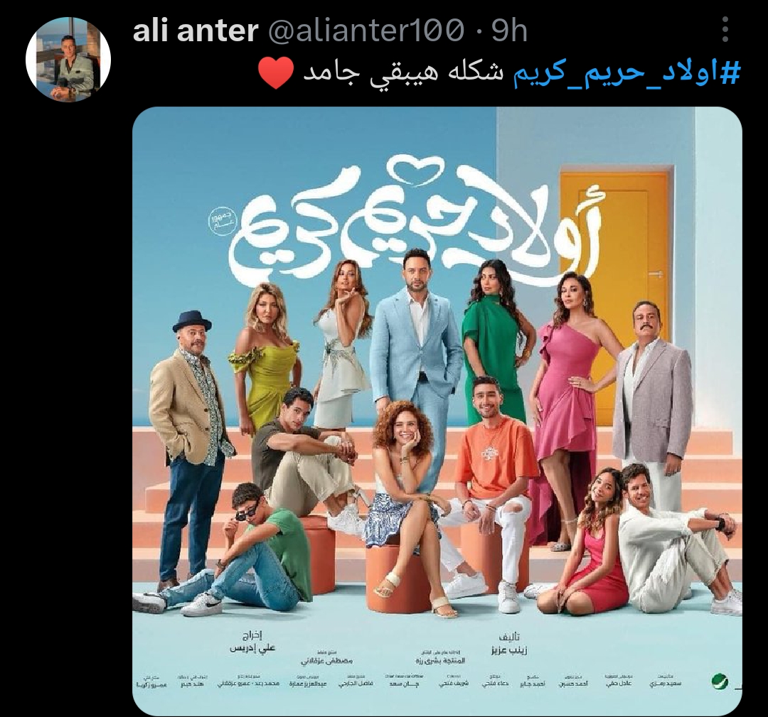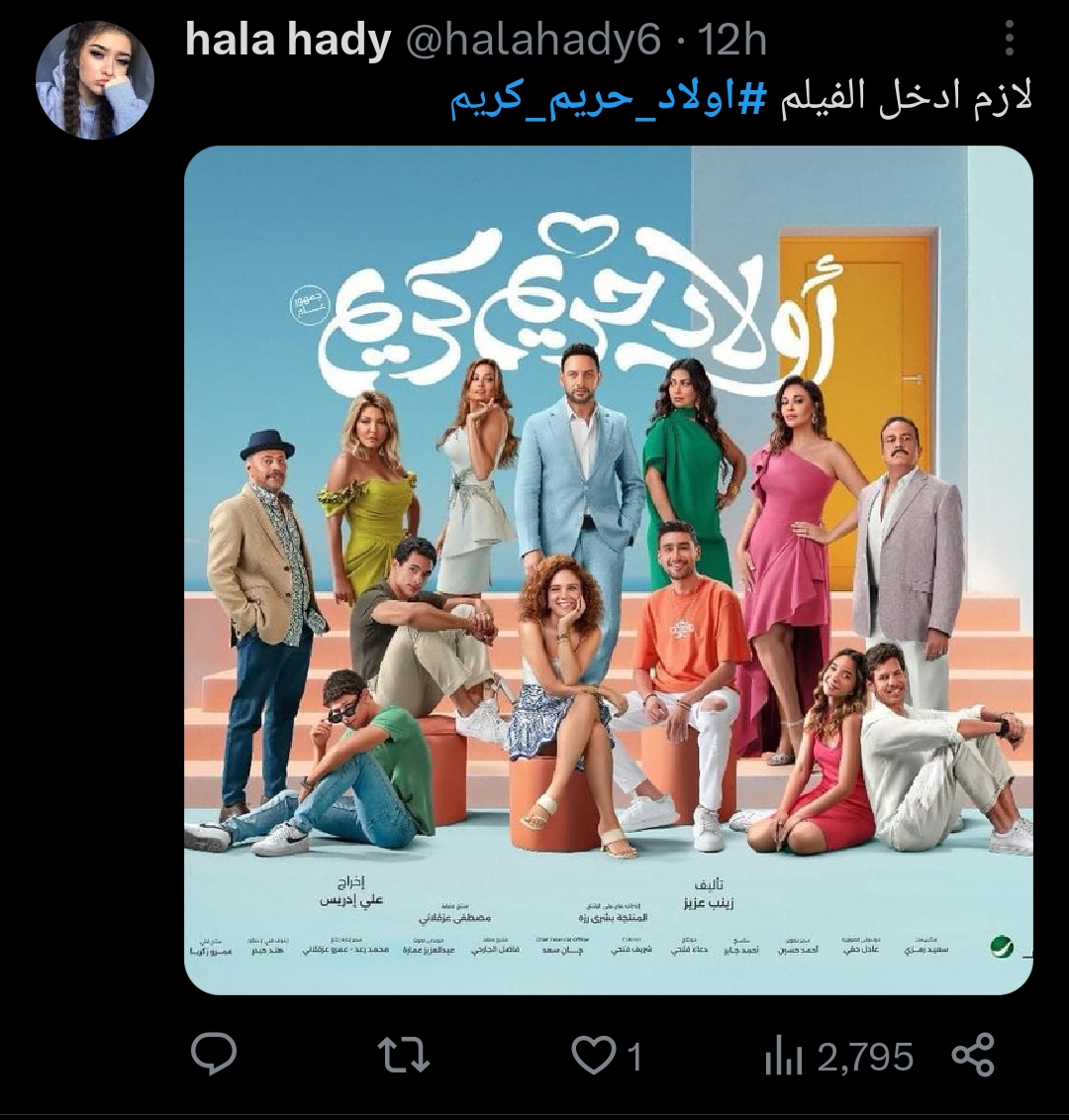 تصدر فيلم “ أولاد حريم كريم ” محرك البحث على موقع التواصل الاجتماعي “ تويتر ”، و ذلك بعد أول يوم عرضه مساء أمس الأربعاء بجميع دور العرض السينمائية .