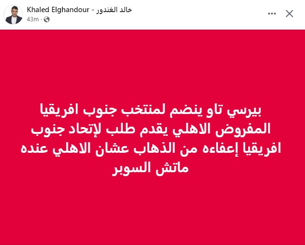 وقال:"بيرسي تاو ينضم لمنتخب جنوب افريقيا المفروض الاهلي يقدم طلب لإتحاد جنوب افريقيا إعفاءه من الذهاب عشان الاهلي عنده ماتش السوبر".