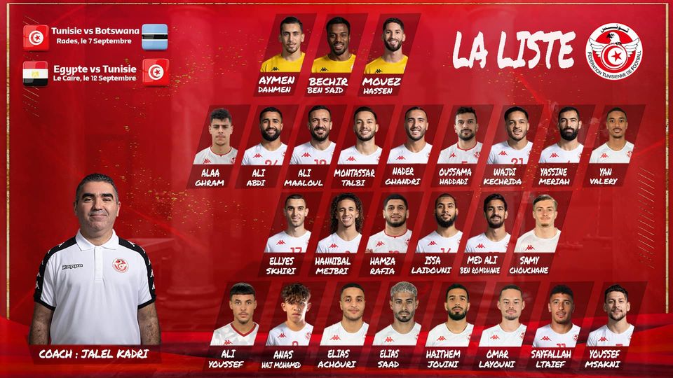 وجاءت قائمة منتخب تونس لمواجهة مصر وبوتسوانا كالتالي: