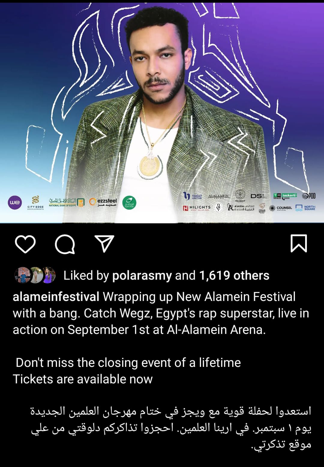 نشر مهرجان العلمين على صفحتهم الرسمية عبر موقع تبادل الصور و الفيديوهات “ انستجرام ” البوستر الخاص بالحفل و علقوا “ استعدوا لحفلة قوية مع ويجز في ختام مهرجان العلمين الجديدة يوم 1 سبتمبر في أرينا العلمين . ”