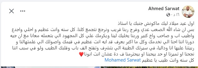 وقال نجل الفنان محمد ثروت عبر صفحته الشخصية على موقع التواصل الاجتماعى “فيس بوك”،" اول عيد ميلاد ليك ماكونش جنبك يا استاذ بس ان شاء الله الصعب عدي وفرج ربنا قريب ونرجع نتجمع كلنا. كل سنه وانت عظيم و احلي واجدع واطيب اب و صاحب واخ كبير وربنا يخليك لينا ويكرمك علي كل المجهود الي بتعمله معانا مع ان جيه دورنا اننا احنا الي نخدمك وكل ما اكبر بعرف قد ايه انت عظيم في قيمك واصولك الي علمتهالنا و ربيتنا عليها انا وداليا، في سيرتك الطيبة الي بتشرف وتفتح الف باب وقلبك الطيب ولو في سبب اننا نجحنا او تميزنا او حد بيحبنا او بيحترمنا ف دة عشان انت ابونا.. كل سنه وانت طيب يا عظيم"