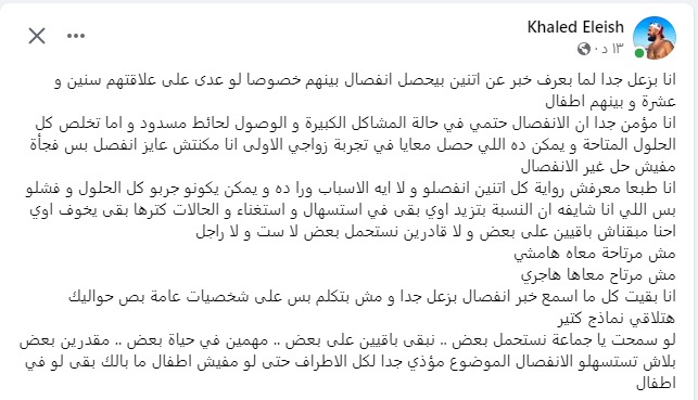 وتابع فى منشور عبر صفحته الشخصية على مواقع التواصل الاجتماعى ـ" مش مرتاحة معاه هامشي مش مرتاح معاها هاجري انا بقيت كل ما اسمع خبر انفصال بزعل جدا و مش بتكلم بس على شخصيات عامة بص حواليك هتلاقي نماذج كتير لو سمحت يا جماعة نستحمل بعض .. نبقى باقيين على بعض .. مهمين في حياة بعض .. مقدرين بعض بلاش تستسهلو الانفصال الموضوع مؤذي جدا لكل الاطراف حتى لو مفيش اطفال ما بالك بقى لو في اطفال ".