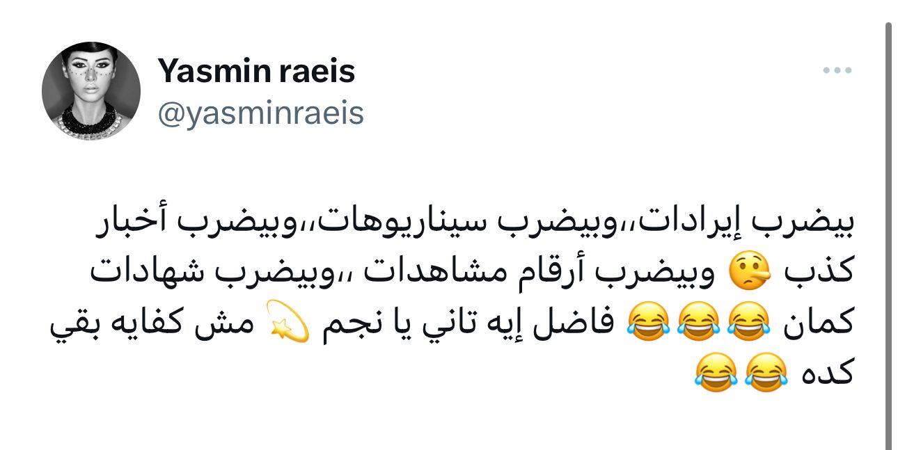 أثارت الفنانة ياسمين رئيس الجدل بعد نشرها بوست غامض على صفحتها الشخصية عبر موقع “×” تويتر سابقا بقولها “ بيضرب إيرادات وبيضرب سيناريوهات وبيضرب أخبار كذب وبيضرب أرقام مشاهدات وبيضرب شهادات كمان، فاضل إيه تاني يا نجم، مش كفاية بقى كده”.
