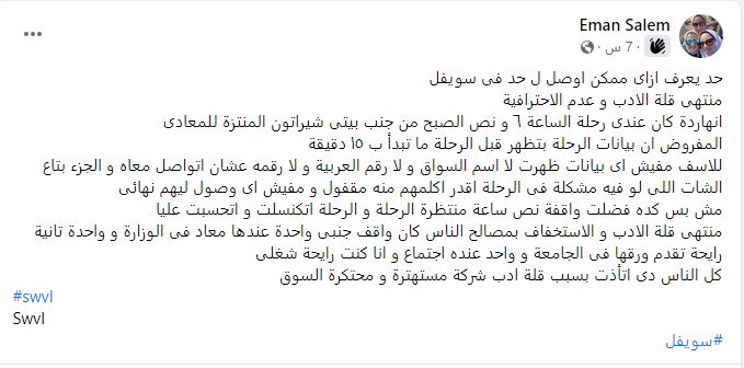 حذر عدد من المواطنين من التعامل مع شركة سويفل ، مستعرضين تجاربهم الشخصية ، حيث استغاثت إحدى الفتيات على السوشيال ميديا قائلة " حد يعرف ازاى ممكن اوصل ل حد فى سويفل منتهى قلة الادب و عدم الاحترافية انهاردة كان عندى رحلة الساعة ٦ و نص الصبح من جنب بيتى شيراتون المنتزة للمعادى المفروض ان بيانات الرحلة بتظهر قبل الرحلة ما تبدأ ب 15 دقيقة للاسف مفيش اى بيانات ظهرت لا اسم السواق و لا رقم العربية و لا رقمه عشان اتواصل معاه و الجزء بتاع الشات اللى لو فيه مشكلة فى الرحلة اقدر اكلمهم منه مقفول و مفيش اى وصول ليهم نهائى ".