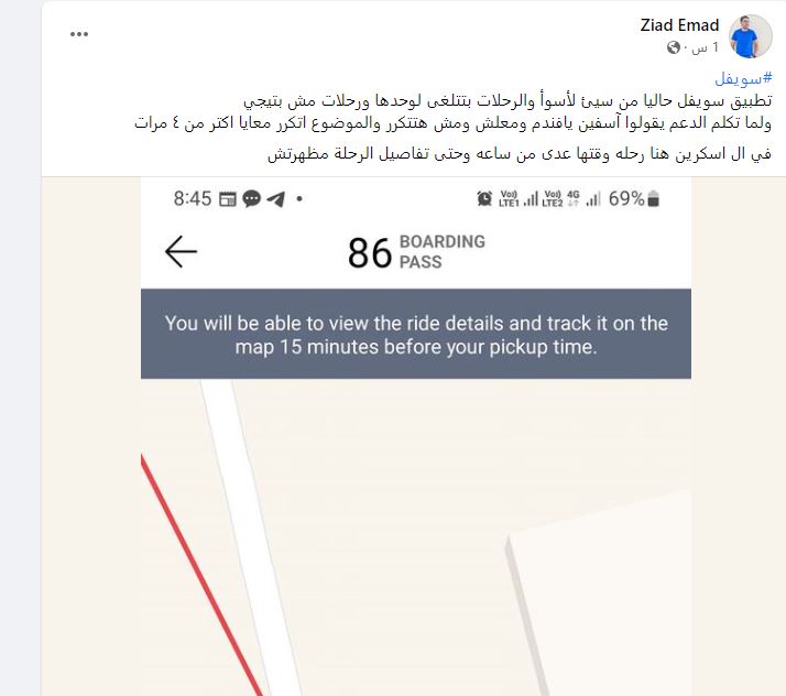 وقال شاب اخر مستعرضا مشكلته مع تطبيق سويفل" تطبيق سويفل حاليا من سيئ لأسوأ والرحلات بتتلغى لوحدها ورحلات مش بتيجي ولما تكلم الدعم يقولوا آسفين يافندم ومعلش ومش هتتكرر والموضوع اتكرر معايا اكتر من 4 مرات في ال اسكرين هنا رحله وقتها عدى من ساعه وحتى تفاصيل الرحلة مظهرتش".