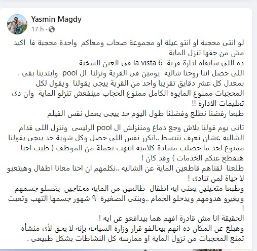وتابعت السيدة عن قرية la vista 6 فى العين السخنة، "طبعا رفضنا نطلع وفضلنا طول اليوم حد ييجى يعمل نفس الفيلم تانى يوم قولنا بلاش وجع دماغ ومننزلش ال pool الرئيسى وننزل اللى قدام الشاليه عشان نعرف نتبسط ..اتكرر نفس اللى حصل وكل شوية حد ييجى يقولنا ممنوع لحد ما حصلت مشادة كلاميه انتهت بجملة من الموظف ( طيب احنا هنقطع عنكم الخدمات ) وقد كان !طلعنا لقناهم قاطعين الماية عن الشاليه ..نكلمهم ان احنا معانا اطفال وهيتعبو لا حياة لمن تنادى ! وطبعا متخيلين يعنى ايه اطفال طالعين من الماية محتاجين يغسلو جسمهم ويغيرو هدومهم ويدخلو الحمام ..وبنتى الصغيرة 9 شهور جسمها التهب وتعبت ! الحقيقة انا مش قادرة افهم هما بيدافعو عن ايه !وهبلغ عن المكان ده انهم بيخالفو قرار وزارة السياحة بإنه لا يحق لأى منشأة تمنع المحجبات من نزول الماية او ممارسة كل النشاطات بشكل طبيعى .