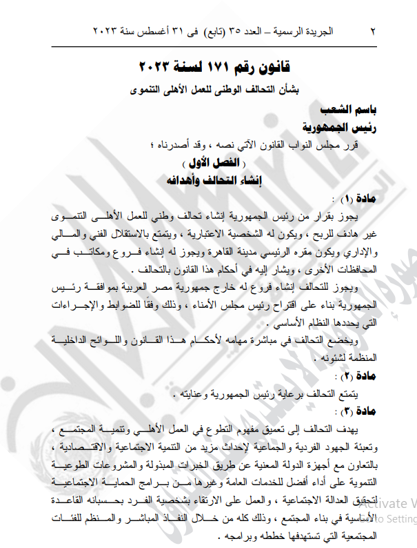 صدق الرئيس عبد الفتاح السيسي، رئيس جمهورية مصر العربية، على قانون رقم 171 لسنة 2023 بشأن التحالف الوطني للعمل الأهلى التنموى.